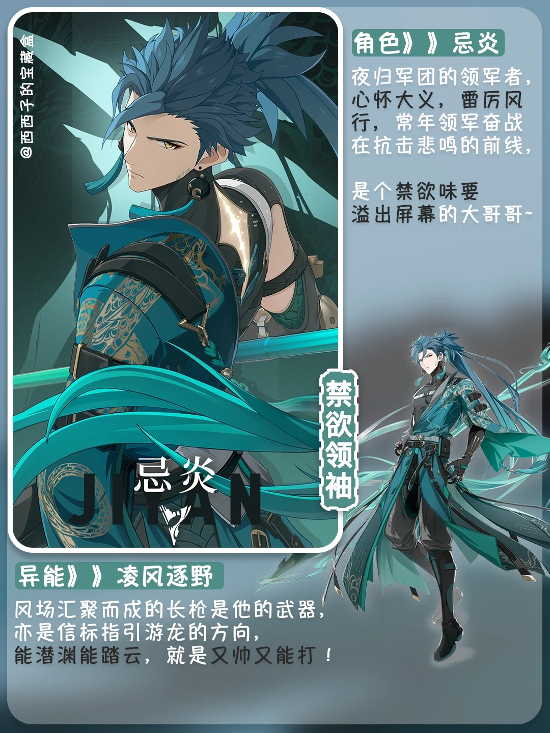 忌炎👉夜归军团的领军者,心怀大义,雷厉风行,常年领军奋战在抗击悲鸣的前线,[萌萌哒R]是个禁欲味要溢出屏幕的大哥哥~([暗中观察R]请多来点帅气男角色)
