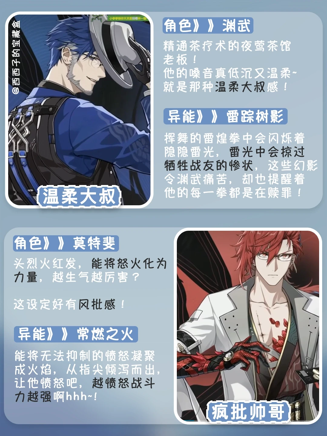 渊武👉精通茶疗术的夜莺茶馆老板!🍵他的嗓音真低沉又温柔~就是那种温柔大叔感!