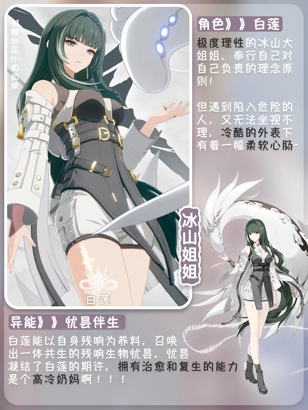 白莲👉极度理性的冰山大姐姐,🧊奉行自己对自己负责的理念原则,但遇到陷入危险的人,又无法坐视不理,冷酷的外表下有着一幅柔软心肠~