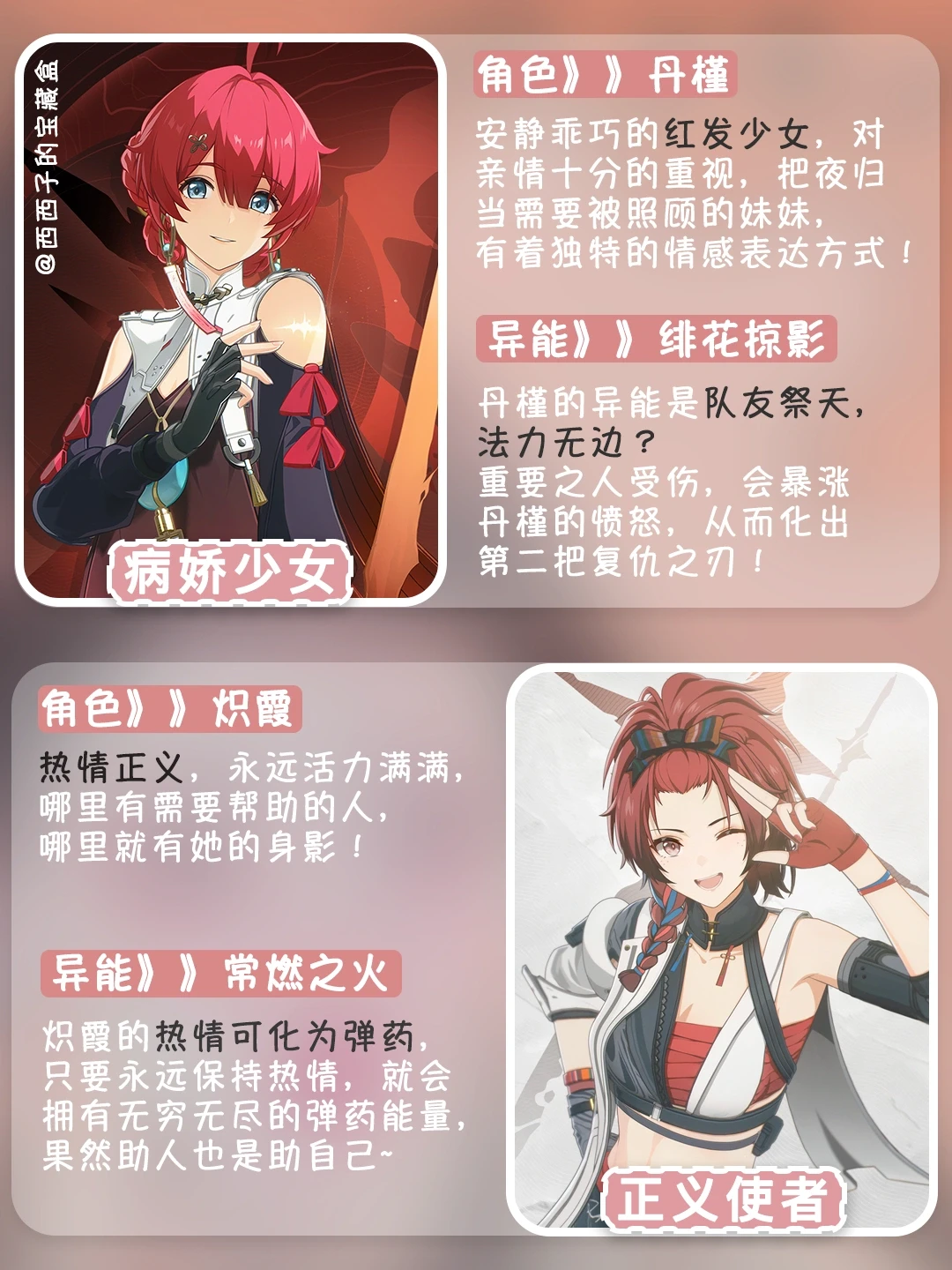 丹槿👉安静乖巧的红发少女,对亲情十分的重视,把整个夜归当需要被照顾的妹妹,❤️有着独特的情感表达方式!
