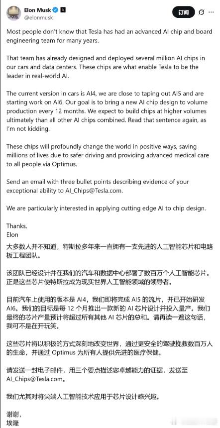 报道称埃隆・马斯克(Elon Musk)通过其 X 平台喊话,声称特斯拉若想在“真实世界 AI”的竞赛中获胜,其 AI 芯片产量必须超过英伟达、AMD 及所有其他科技巨头的总和。