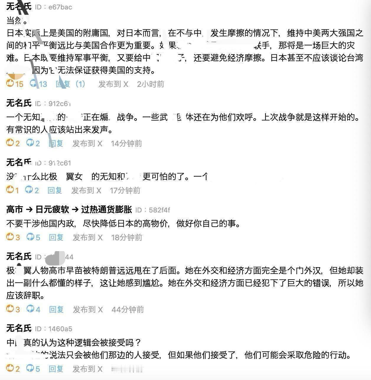 那些嘴硬的日本人开始认怂!怒批高市内阁无知且正在“挑起战争” 在日本媒体《时事通讯社》有关中美通话确认台湾问题立场的一篇报道评论下面,许多日本网友在看到特朗普承认台湾问题对中方的重要性后,这些日本网友集体失态了,话语中充满焦虑感。他们认为美国人可能不支持日本,日方的挑衅行为无法得到美国的认同,而日本只不过是美国的附庸,因此特朗普会约束高市早苗不要走的太远。 一位日本网友评论道:“极佑翼人物高市早苗被特朗普远远甩在了后面。她在外交和经济方面完全是个门外汉,但她却装出一副什么都懂的样子,这让她感到尴尬。她在外交和经济方面已经犯下了巨大的错误,所以她应该辞职。” 高市早苗为何执意要对中国“搞事” 高市早苗为何频繁对中国口出狂言 中美通话