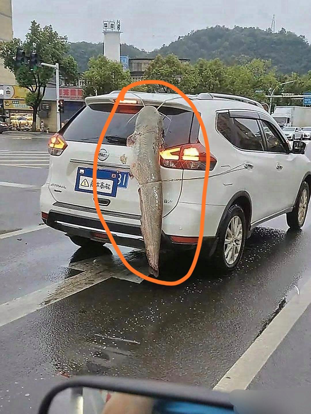 今日途中,偶然撞见“硬核载物”一幕——这位车主估计刚钓到一条“巨物”,直接将大鱼绑在车尾,当作“移动战利品”。这阵仗,回头率可比车顶行李箱高多了!只是雨天路滑,可得留意这“活(?)挂件”,别甩到路人。