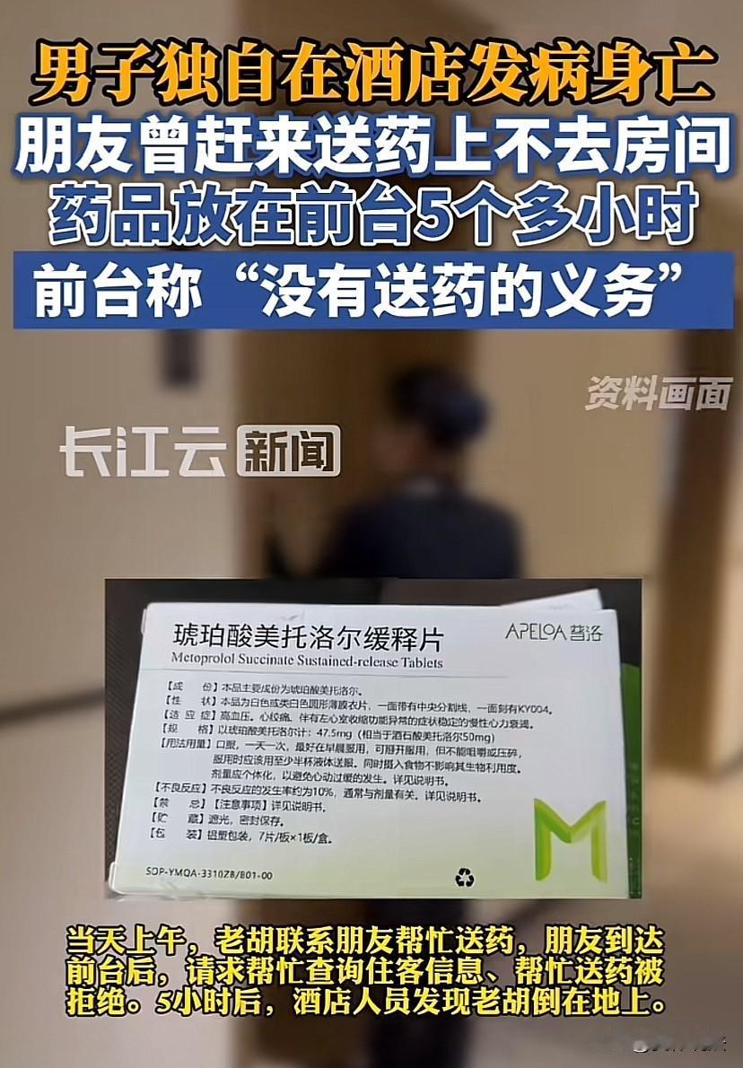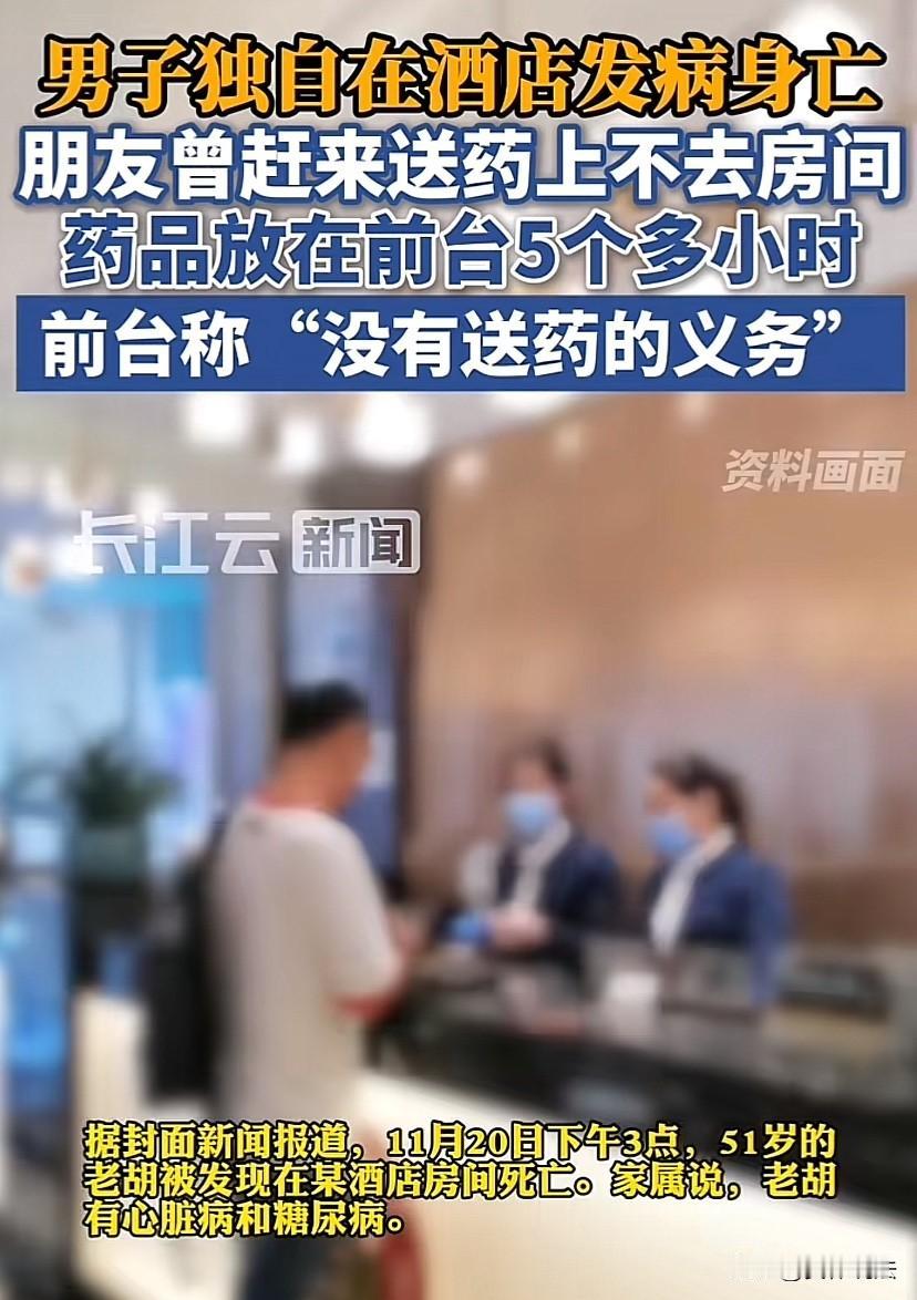 湖北武汉,男子在酒店发病,托朋友送药。男子的朋友因不知道男子的全名、房间号,也不知道男子什么病,情况如何,联系男子未果后,将药交给酒店前台,请求酒店前台查询后帮忙给男子送到房间。酒店表示没有送药的义务,让男子的朋友联系男子自己取药。男子朋友随后又联系男子未果,因有急事遂将药放在前台。结果,酒店前台也没有当回事,5个小时后,到了退房时间查房时,才发现男子已经在房间里死亡。事后,男子家属难以释怀,认为欲追究酒店的责任。 据悉,老胡近年来一直在老家承包土地,搞农业合作社,经常外出谈业务。 11月19日晚上,老胡出差办完事后,与多年未见的朋友韩某小聚了一番,事后入住一酒店。 次日早晨,老胡声称不舒服,联系韩某,让韩某帮自己去另一个朋友家中取药。 虽然不知道老胡是哪里不舒服,又是要取什么药,韩某没有推脱,当即去老胡所说的另一个朋友家中取药。 韩某拿到药后,便往酒店赶,可到了酒店后,因联系不上老胡,又不知道老胡的全名,便将药交给酒店的前台,请求酒店前台查询后帮忙把药送到老胡的房间。 怎料,酒店的前台却表示没有义务帮忙送药,让韩某自己联系老胡取药。 韩某随后又给老胡打了几个电话,见老胡还是没接,又加之有其他急事需要处理,便给老胡发了个信息留了个言,告知老胡药在前台,而后离开。 结果,事后,酒店前台也没当回事,转眼5个小时过去了,等到当日下午3点到了退房时间,查房时,发现老胡已经死亡。 事后,老胡的家人难以释怀,表示老胡一直患有心脏病、糖尿病,让朋友韩某送的药也是治疗心绞痛、高血压和糖尿病的药物,法医推定老虎系因突发疾病死亡,死亡时间大约是中午12点到下午2点,具体死亡原因还待尸检确定。 认为酒店明知道有客人生病,且失去联系,如果及时进行排查、抢救,或许就不会发生这样的悲剧。欲追究酒店的责任! 对此,涉事酒店回应,酒店前台没有说过“无帮忙送药的义务”,当时送药的韩某说不出老胡的姓名,也没说老胡是什么病,酒店前台处于隐私考虑,也没有打开塑料袋看是什么药品,没想到是紧急情况,没有多想一步、多操作一步。 那从法律上该如何看待此事?酒店有没有给客人送药的义务?发生这样的事情,酒店要不要承担责任? 《民法典》第1198条规定,宾馆、商场、银行、车站、机场、体育场馆、娱乐场所等经营场所、公共场所的经营者、管理者或者群众性活动的组织者,未尽到安全保障义务,造成他人损害的,应当承担侵权责任。 酒店作为经营者依法对消费者以及潜在的消费者或者其他进入经营场所的人身、财产安全负有危险预防、消除的安全保障义务。 而基于该义务,酒店在得知客人生病后,就产生了送药,乃至救助的义务。 涉事酒店的前台虽然不知道老胡的病情以及药品种类,但是明知道作为客人的老胡已经生病,就应该意识相应的后果,积极排查,了解情况。 涉事酒店的前台竟然将老胡的药放在前台,长达5个小时,期间什么也没做,主观上至少存在疏忽大意、甚至过于自信的过失。 《民法典》第1165条规定,行为人因过错侵害他人民事权益造成损害的,应当承担侵权责任。 第1191条规定,用人单位的工作人员因执行工作任务造成他人损害的,由用人单位承担侵权责任。用人单位承担侵权责任后,可以向有故意或者重大过失的工作人员追偿。 涉事酒店存在过错,如果有证据证明老胡确实是突发疾病死亡,并且酒店的的过错与老胡的死亡确实存在关系,涉事酒店就需要承担赔偿责任。 当然,我们每个人都是自身生命健康的第一责任人,老胡如果确系突发疾病死亡,应对自身死亡的结果承担主责。 根据《民法典》第1173条的规定,“被侵权人对同一损害的发生或者扩大有过错的,可以减轻侵权人的责任”。可以依法减轻酒店的赔偿责任。 据悉,经过调解,涉事酒店目前只愿意出于人道主义赔偿老胡的家人2万元。 而老胡的家人不愿意接受涉事酒店的方案,表示老胡上有80岁的父母,下有刚刚出生的孙子,父子俩搞农村合作社还有上百万元贷款未还,准备通过解刨老胡的遗体和司法鉴定,以确定酒店的过失比例和则责任。 这事您怎么看?欢迎在评论区留言,与大家一起交流您的看法! ------ 关注@安律说法 案例中看人生百态,法律中寻破局之法!