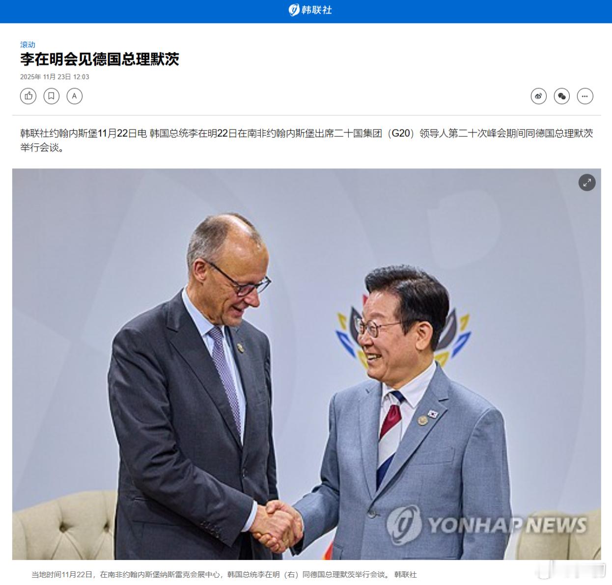 《朝鲜日报》:韩国总统李在明在G20会见了德国总理默茨,当默茨问到:“我很好奇韩国对中国的看法,因为德国正在苦思对华战略。”李在明总统没有正面作答。他表示:“德国走在前面,韩国有很多要学的......如何克服分裂统一德国,韩国需要学习......如果有秘密技巧,请一定要告诉我”。德国总理尴尬的回答:“没有秘密技巧。”