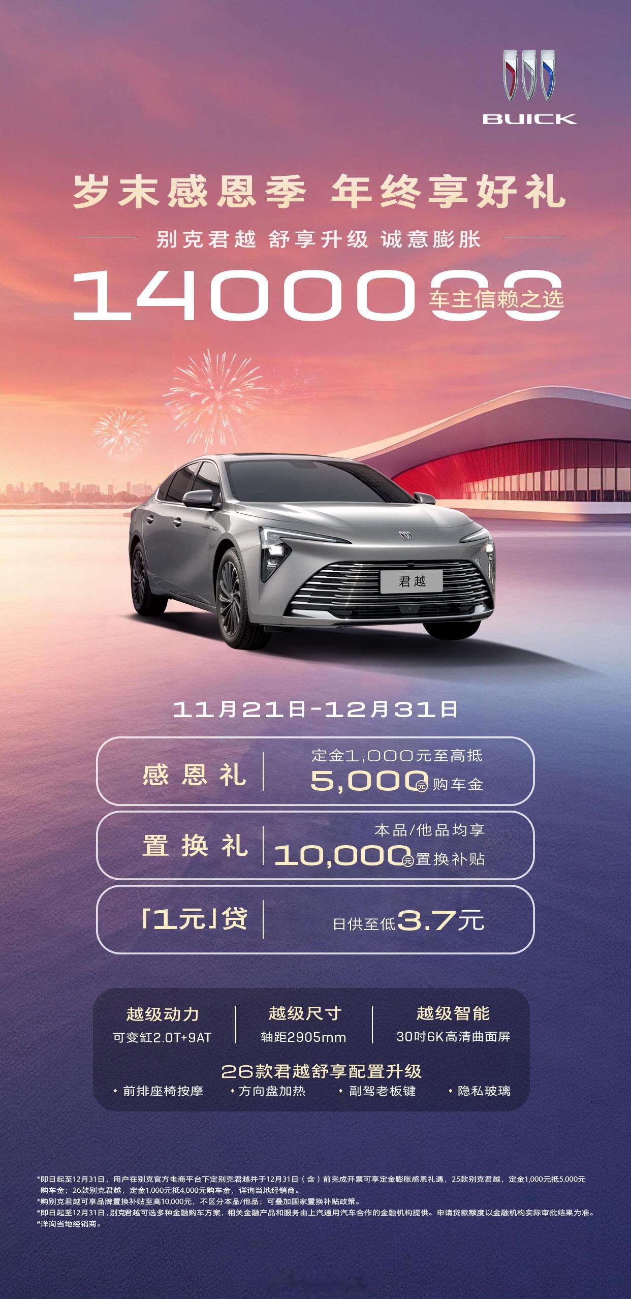 今天,别克君越在上汽通用汽车金桥基地迎来第140万辆整车下线。为回馈广大用户对君越的青睐,别克品牌开启“岁末感恩季 年终享好礼”钜惠活动:即日起至12月31日,消费者购买君越,可享定金1000元至高抵5000元购车金,并可在“一口价”基础上,享受本品/他品置换10000元品牌补贴,并叠加享受至高15000元国补。别克君越经过四代产品进化,不断以迭代升级的科技打造越级产品、越级体验。在140万辆新起点上,别克君越将继续聚焦消费者需求和市场趋势,为更多用户带来与时代同频的卓越驾乘体验。
