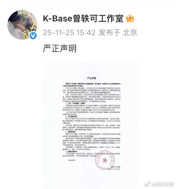 25 日, 发布严正声明,针对其 “曾轶可迷人的危险巡演” 相关争议作出回应,同时宣布与合作居间方解约。声明称,自 2024 年与北京当作音乐文化发展有限公司签订合作协议后,曾轶可及团队始终按约完成演出筹备,但对方多次未履行合同义务,包括未按时支付费用、临时变更筹备流程、捏造不实信息等,已严重阻碍演出推进并损害其合法权益。针对近期网络不实舆情,工作室澄清称,相关内容系合作方内部人员发布并恶意传播,曾轶可本人从未发布相关言论,工作室保留追究法律责任的权利。同时,工作室宣布已正式向合作方发出解约通知,自即日起曾轶可不配合对方安排的广州、北京、杭州等场次演出,票务及退票问题由相关主办方承担,工作室将积极配合保障消费者权益。此外,工作室表示对此次事件造成的困扰深感遗憾,目前正积极联系新场地,计划在原定日期举办专属见面会弥补遗憾,具体信息将通过官方渠道公布,并强调会委托律师追究造谣、攻击行为的法律责任。
