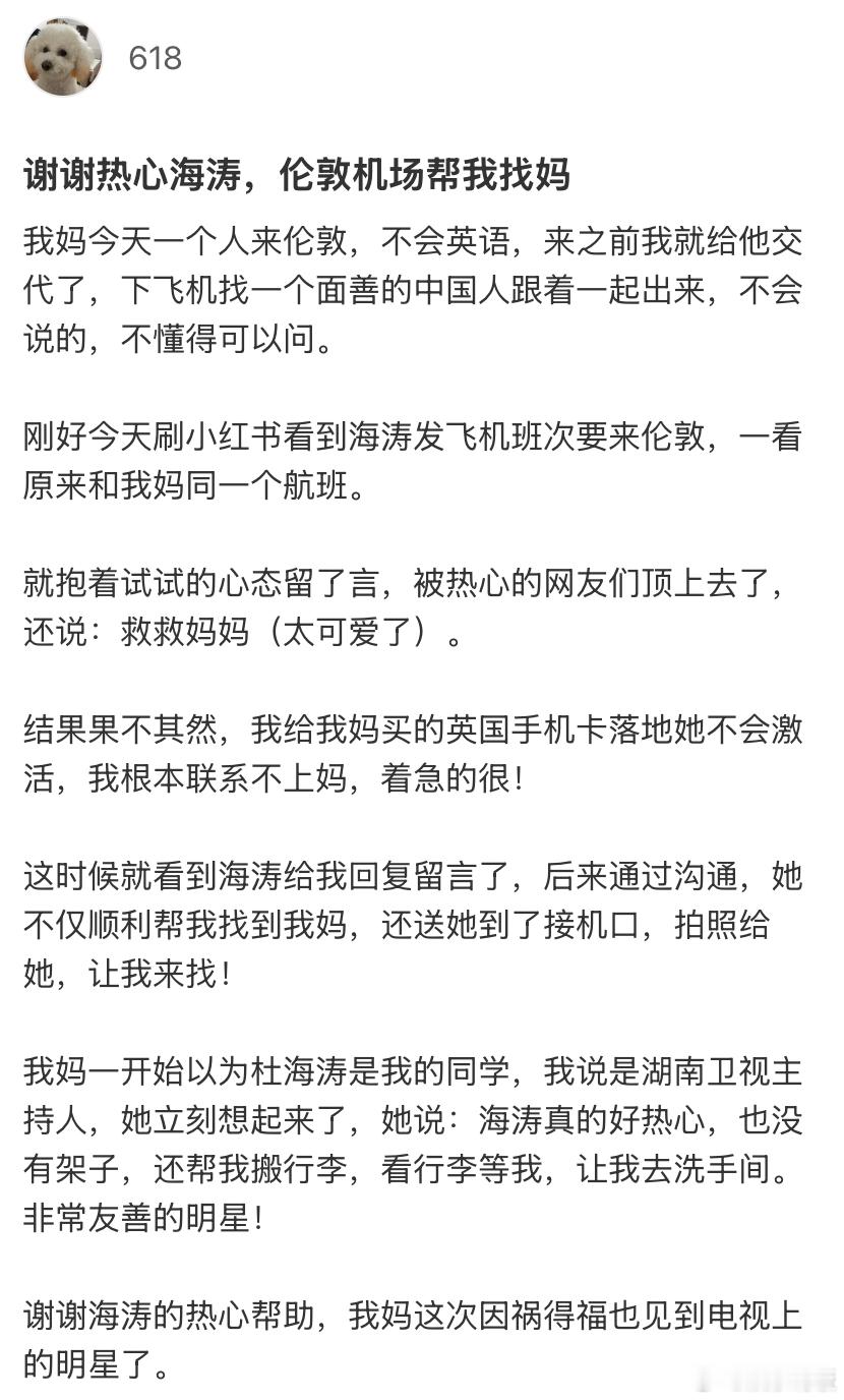 杜海涛近期的英国行程,堪称 “热心肠限定版出差”—— 不仅在伦敦机场帮网友找到不会英语的妈妈,还化身 “国际快递员” 帮粉丝带东西、送信,网友都调侃他 “好事做尽”“忙得像唐僧”