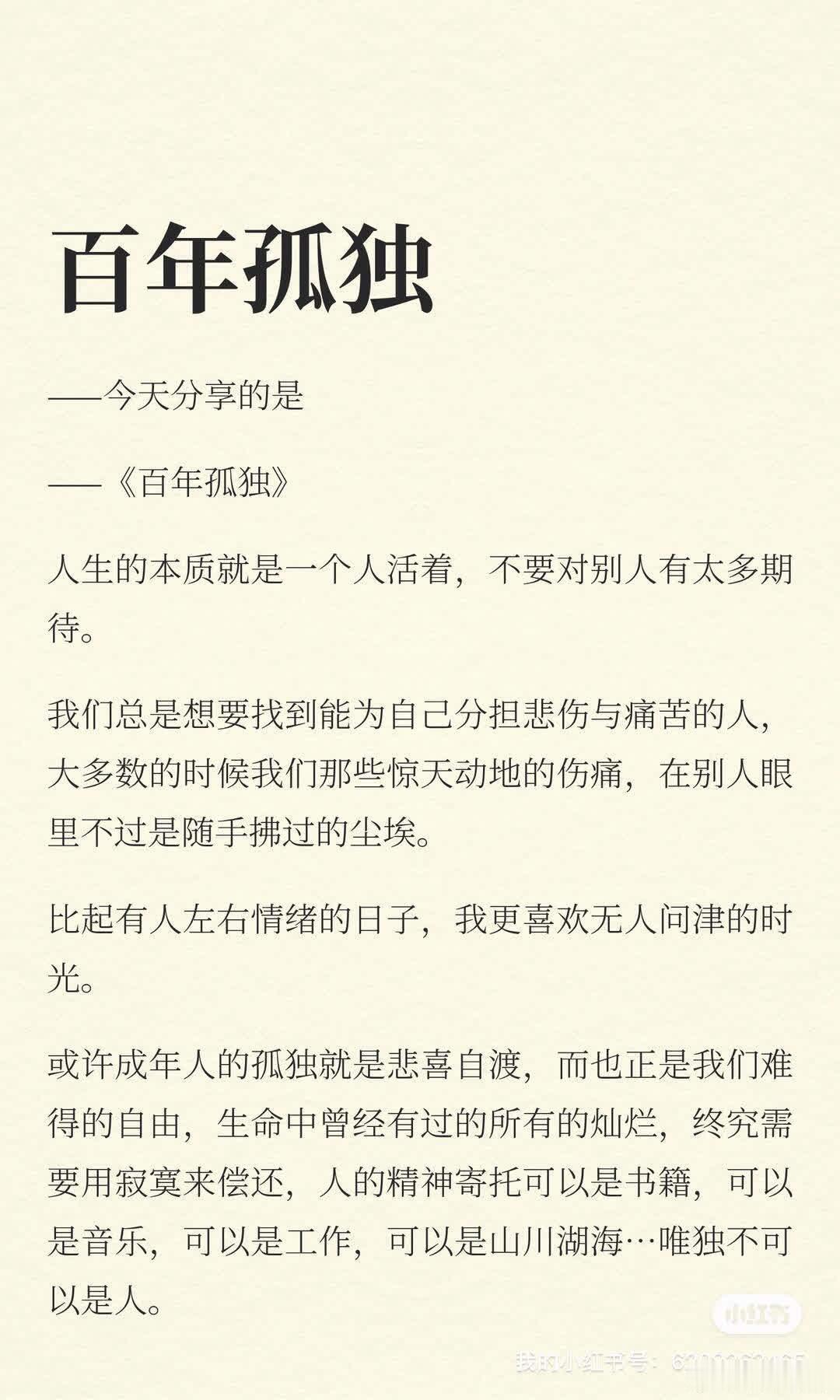 ——今天分享的是 ——《百年孤独》 人生的本质就是一个人活着,不要对别人有太多期待。 我们总是想要找到能为自己分担悲伤与痛苦的人,大多数的时候我们那些惊天动地的伤痛,在别人眼里不过是随手拂过的尘埃。 比起有人左右情绪的日子,我更喜欢无人问津的时光。 或许成年人的孤独就是悲喜自渡,而也正是我们难得的自由,生命中曾经有过的所有的灿烂,终究需要用寂寞来偿还,人的精神寄托可以是书籍,可以是音乐,可以是工作,可以是山川湖…唯独不可以是人。我们生来就是孤独