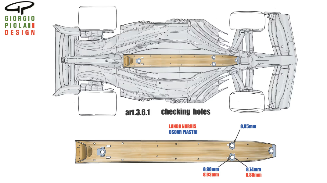 赛后车检木板磨损检测有四个点,前后各两个。Giorgio Piola画了下图,标出了两台赛车磨损过度的位置,诺里斯赛车是右侧的两个点,皮亚斯特里除了右侧之外,还有左前的检测点不达标。