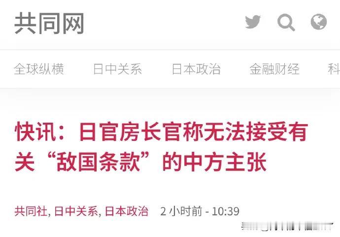 真有脸了,日本官房长官:无法接受有关“敌国条款”的中方主张。 据日本共同社报道,日本官房长官木原稔25日在记者会上称无法接受与事实不符的中方主张,此前中方对日方引用了联合国宪章中的“敌国条款”。 但他随即话锋一转,强调日本将“基于与美国之间牢固的互信关系”,继续要求中方“履行与其国际地位相称的责任”。而且他表示日本不接受中方对“敌国条款”的主张。 日本官房长官木原稔这话说得,真是让人开眼。25日的记者会上,他说“无法接受中方有关‘敌国条款’的主张”,还说中方的说法“与事实不符”。这话从他嘴里说出来,倒像是忘了自家的底细。 “敌国条款”是什么?《联合国宪章》里第53条、第77条、第107条写得明明白白。那是二战结束后,专门给德国、意大利、日本这些战败国套上的紧箍咒。 怕的就是它们好了伤疤忘了疼,再把世界拖进战火。日本作为当年的侵略国、战败国,被这条款管着,天经地义。这些年,日本不是没动过心思,好几次想让联合国把这条款删了。 可规矩就是规矩,删条款得走联合国的法定程序——三分之二成员国同意,还得五常全点头。到现在,这程序没走完,条款就还稳稳当当立在那儿。木原稔说“与事实不符”,难不成是觉得宪章里的字能自己长腿跑了? 说到底,日方是揣着明白装糊涂。一边在台海搞些不三不四的演练,半点悔改的意思都没有;一边又想把联合国定下的条款推翻,这心思藏得再深,也瞒不过人。 二战的硝烟散了这么多年,可有些教训不能忘。日本当年在亚洲犯下的罪孽,桩桩件件都刻在历史里。“敌国条款”不是为了为难谁,是为了给和平上把锁。现在日方想把锁拆了,是觉得和平这东西,来得太容易了? 中方提“敌国条款”,不是没事找事。是看着日本这些年在军事上的小动作越来越多,心里着急。又是扩军,又是往海外派部队,嘴上喊着“和平”,身子却一个劲往危险的地方凑。 这时候不提条款敲敲警钟,难道等真出了乱子再后悔?木原稔说“无法接受”,听着硬气,实则是没理搅三分。条款白纸黑字写在宪章里,日本是战败国的事实铁证如山,怎么就“与事实不符”了? 难不成想凭着一句话,就把历史改写了?国际社会的眼睛是亮的,谁在维护和平,谁在暗戳戳搞动作,大家心里都有数。日本要是真有诚意,就该踏踏实实反思历史,把精力放在增进邻里关系上。 而不是想着怎么拆联合国的台,怎么绕开条款搞小动作。 “敌国条款”就像面镜子,照出的是日本对历史的态度。敢不敢正视条款,能不能接受约束,考验的是它有没有真心走和平路。 现在木原稔跳出来说“无法接受”,倒像是怕这镜子照出些不想让人看见的东西。说到底,条款删不删,不是日本说了算,更不是木原稔一句话能定的。 只要联合国的程序没走完,只要还有国家记得二战的苦难,这条款就有存在的意义。日本与其在嘴上较劲,不如想想怎么用实际行动赢回信任。 真把条款当回事,就该收敛些,别再做那些让邻居不安的事。台海是中国的家事,轮不到外人指手画脚。老想着往里头插一脚,还不想被条款管着,天下哪有这样的道理? 木原稔的话,听着气人,实则不值一驳。事实就在那儿,宪章上的字擦不掉,历史的账也赖不掉。日本要是还拎不清,继续在错误的路上往前冲,到头来只会发现,“敌国条款”这把锁,只会锁得更紧。