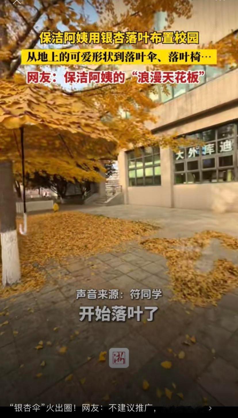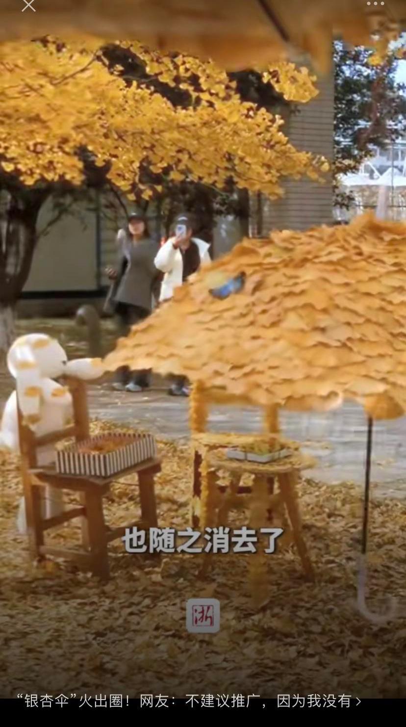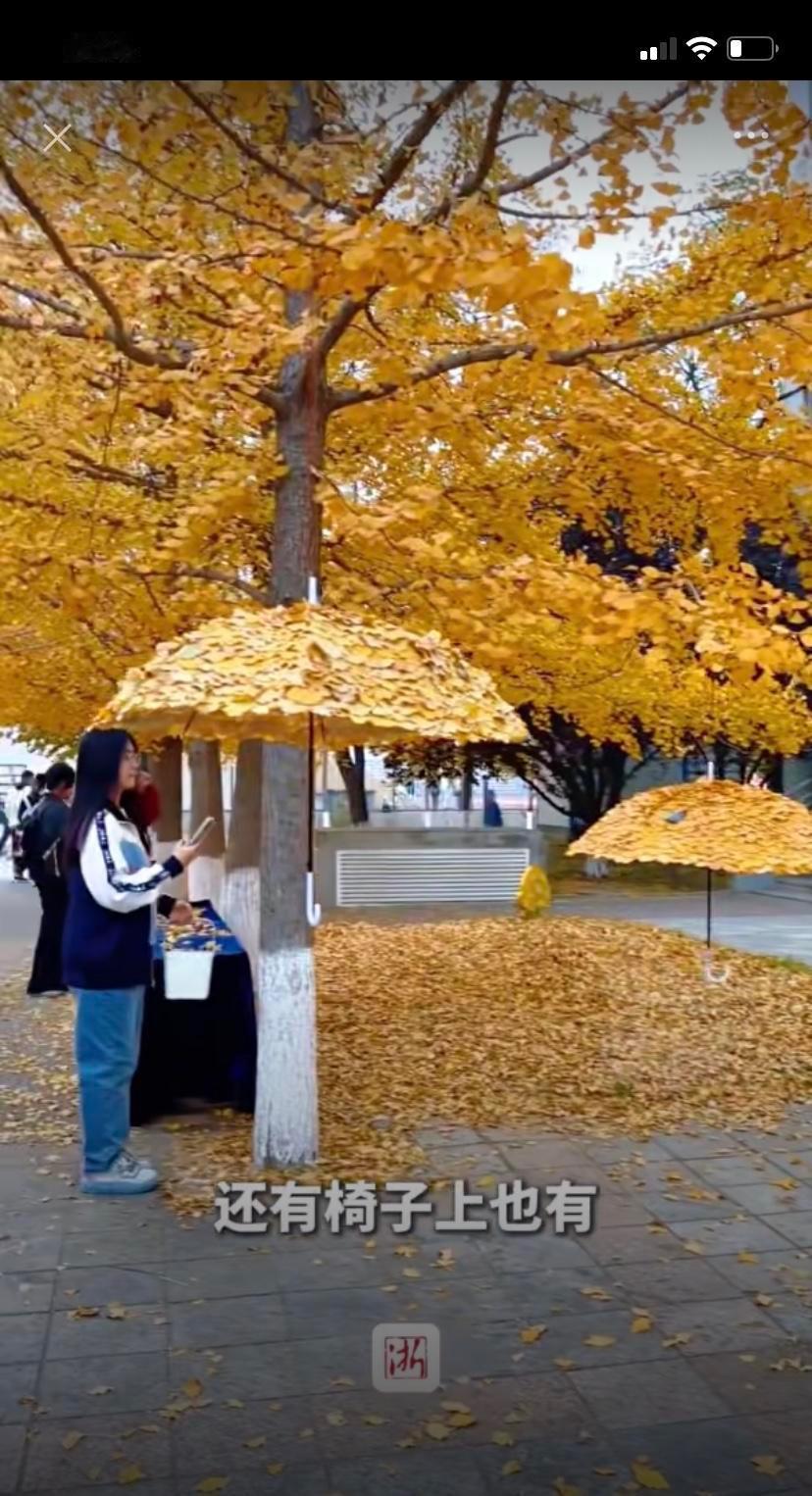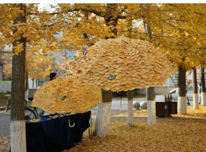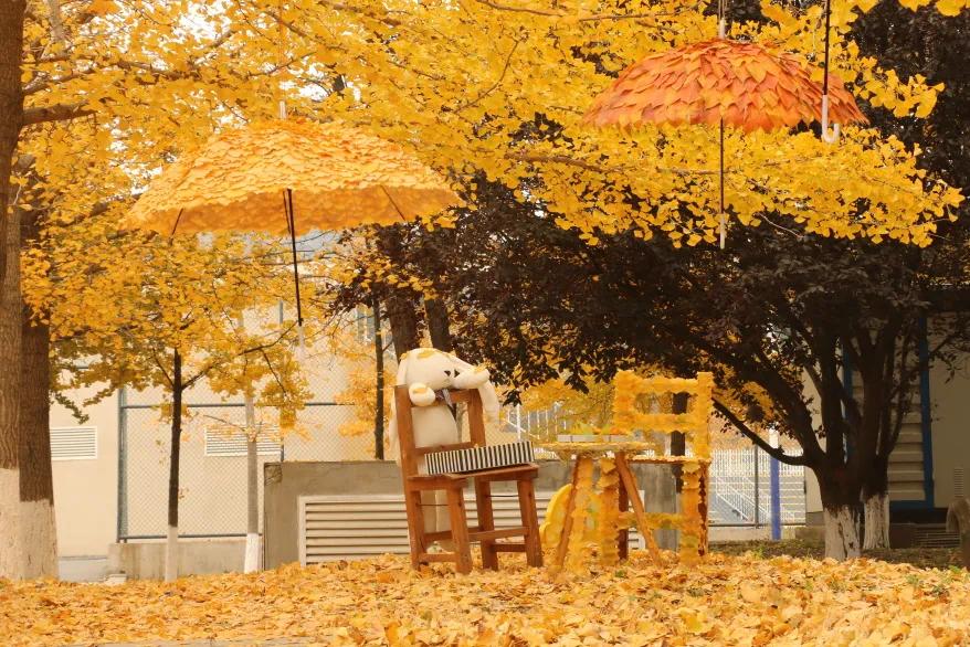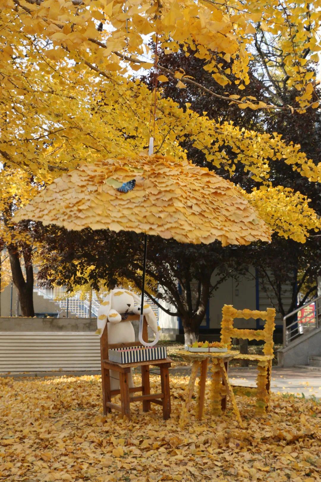 万万没想到 今年的银杏叶以这样的方式火出圈了 大连银杏今年玩出了新花样 而且还是我们的保洁阿姨的杰作 他们的创造力真不赖呢! 一把把黄金颜色的伞 悬空而立 层层叠叠的美 料料悄悄的活力四射 一把金色的椅子 一张黄金色的桌子 太映衬了