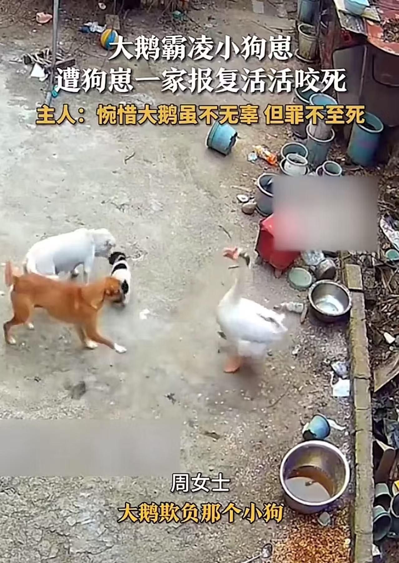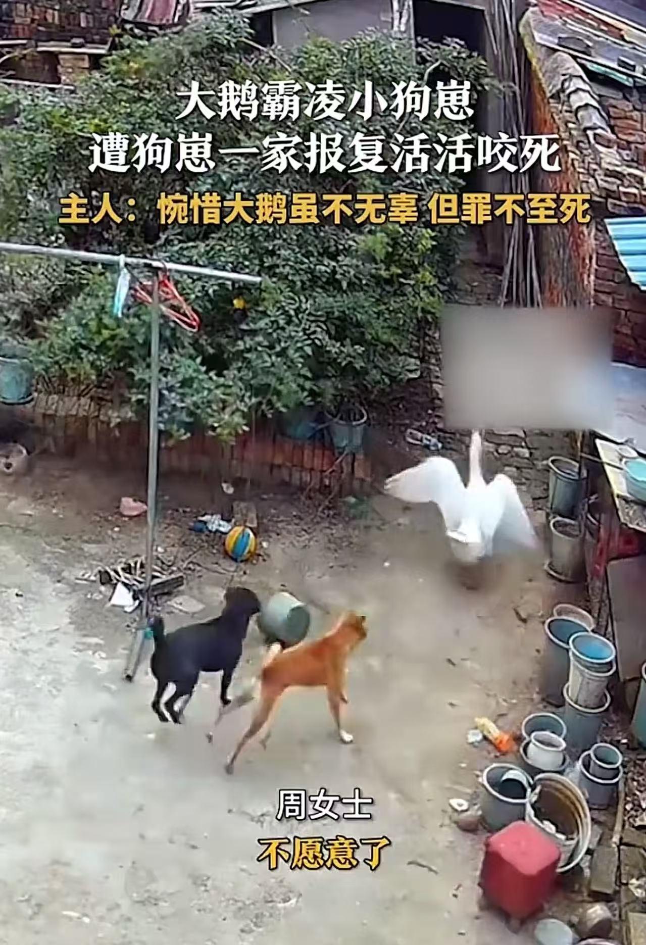 一桩动物界的命案,引发热议!大鹅霸凌小狗崽,遭狗崽一家报复活活咬死。主人:大鹅虽然不无辜,但罪不至死!网友:罪不至死?别说狗了,这鹅要是啄的是我小孩,它今晚也得待锅里! 周女士养的大鹅和几只狗,平时井水不犯河水,没想到因为一次“小摩擦”,竟闹出了“命案”! 这天,周女士出门办事,家里的小狗崽在院子里撒欢玩。小家伙蹦蹦跳跳,不知不觉跑到了大鹅的窝附近。 大鹅一看小狗崽靠近,扑棱着翅膀冲过去,对着小狗崽的脑袋和后背就是几口猛啄! 小狗崽疼得“汪汪”直叫,连滚带爬地逃开,可大鹅不依不饶,追着又啄了两下。 小狗崽的惨叫像警报一样,瞬间传遍了院子。狗爸爸、狗妈妈和狗哥哥听到声音,从各个角落冲了出来——狗妈妈低吼着护住小狗崽,狗爸爸直接扑向大鹅,狗哥哥则从侧面包抄。 大鹅虽然体型大,但面对三只愤怒的狗,根本招架不住。它扑腾着翅膀想逃,却被狗爸爸一口咬住脖子,狗爸爸和狗哥哥也扑上来,你一口我一口,没几分钟,大鹅就瘫在地上,没了动静。 周女士回家时,看到奄奄一息的大鹅,整个人都懵了。她赶紧查看监控,看完她非常感慨说:“大鹅欺负小狗崽确实不对,但也不至于被咬死啊,这也太惨了……” 此事引发热议, 有网友说,大鹅的下场,就应该是霸凌者的下场。反霸凌,就从“让霸凌者明白自己的下场〞开始! 也有网友说,根据动物界法院查明真相后结论如下:1、狗子杀鹅时不法侵害已经结束,不构成正当防卫;2、三只狗子围攻一只鹅,构成故意杀鹅罪。 还有网友说,我关心的是,这鹅还能不能吃?狗咬了,会不会有狂犬病? 周女士觉得大鹅“罪不至死”,是因为她站在“主人”的立场,把大鹅当成了“宠物”;可网友们愤怒,是因为他们代入的是“父母”的角色——如果自己的孩子被欺负,哪怕对方是动物,也会本能地反击,甚至不惜“以命抵命”。 狗一家反击大鹅,是动物界最原始的生存法则——保护弱小,反击侵犯者。 如果真觉得“罪不至死”,就先教会自己的“崽”(无论是孩子还是宠物)别去欺负别人——毕竟,不是所有反击都会留情,也不是所有“无辜”都能被原谅。 最后说句扎心的:在“护崽”这件事上,人类和动物没区别……