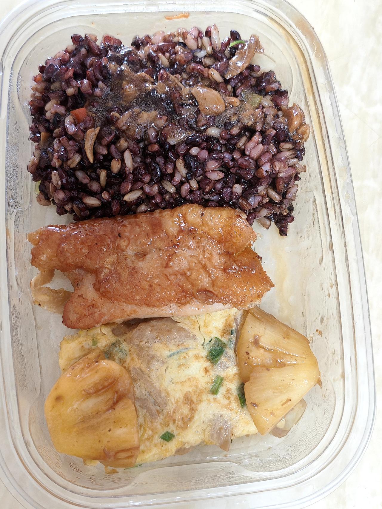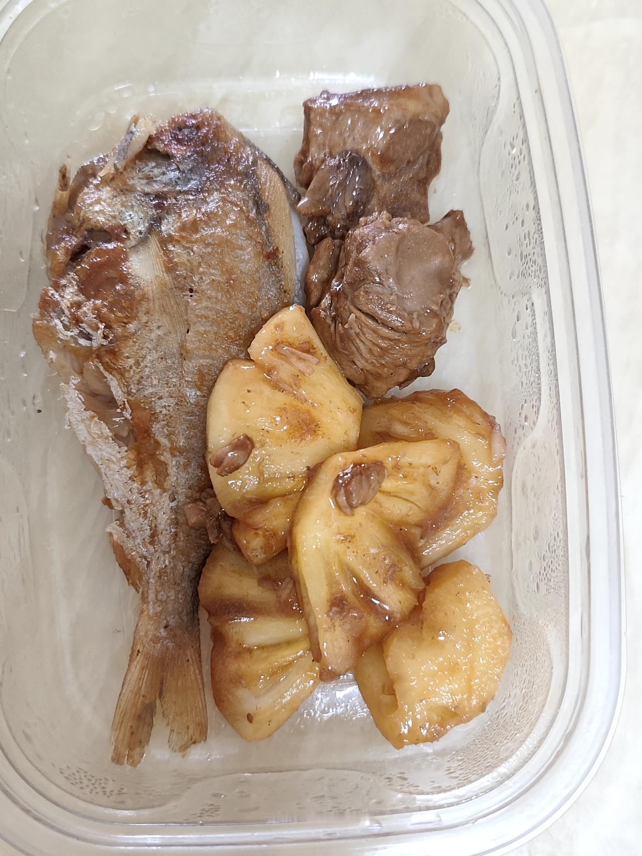 今天过来绿地缤纷城,听别人说有一家称重的自助餐新开张,我自己拿了三个盒子,看看有没有我喜欢的菜,我是想打包带回家吃的,我问清楚称重后是不是可以直接打包带走?店长说可以的,我就装了一盒炒荷兰豆,一盒瘦肉片炒西蓝花,一条煎鱼,一件菜脯煎鸡蛋,菠萝片焖鸭,三盒称重是60元,平均每盒是20元左右,店长说有免费的汤,糖水,粥,杂粮饭,我就装了一点杂粮饭。看看我带回家后拍的照片,60元就这么多了。