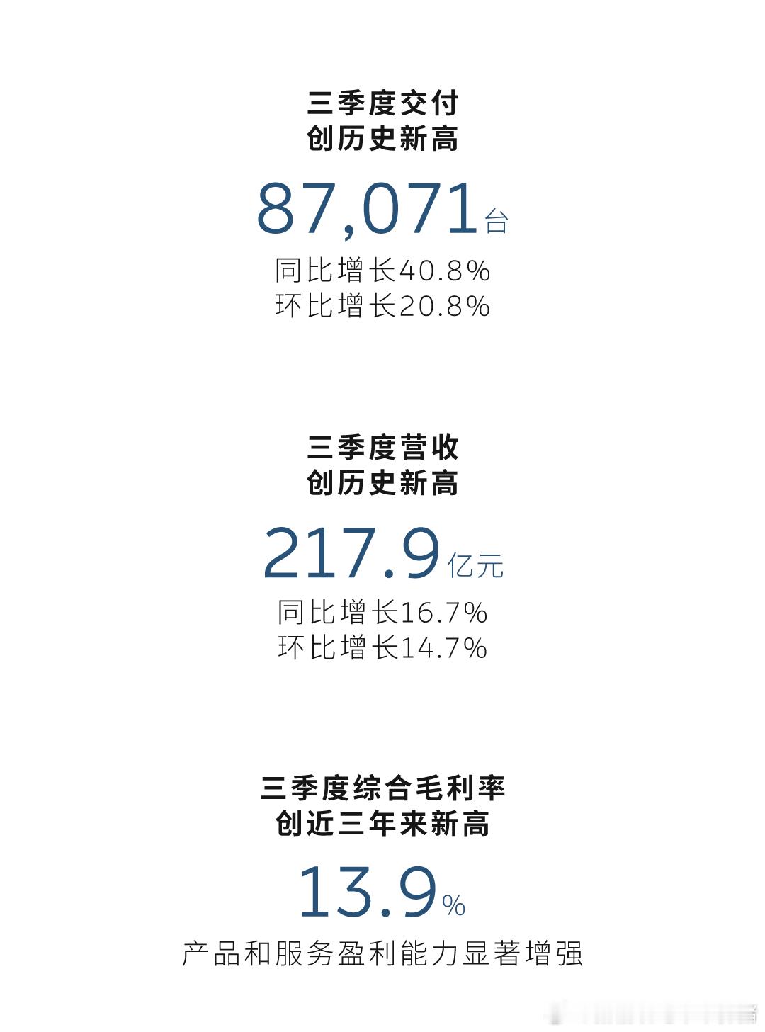 蔚来2025年三季度财报成绩单:交付87071台创历史新高,营收217.9亿元,实现双位数增长,综合毛利率13.9%、整车毛利率14.7%,逼近三年新高,现金储备也涨到367亿元,实现了正向经营性现金流。四季度交付、营收指引双双刷新纪录,换电站、充换电站网络也持续完善,新车型和技术收获了市场和行业认可,稳扎稳打向前跑,第四季度盈利指日可待~
