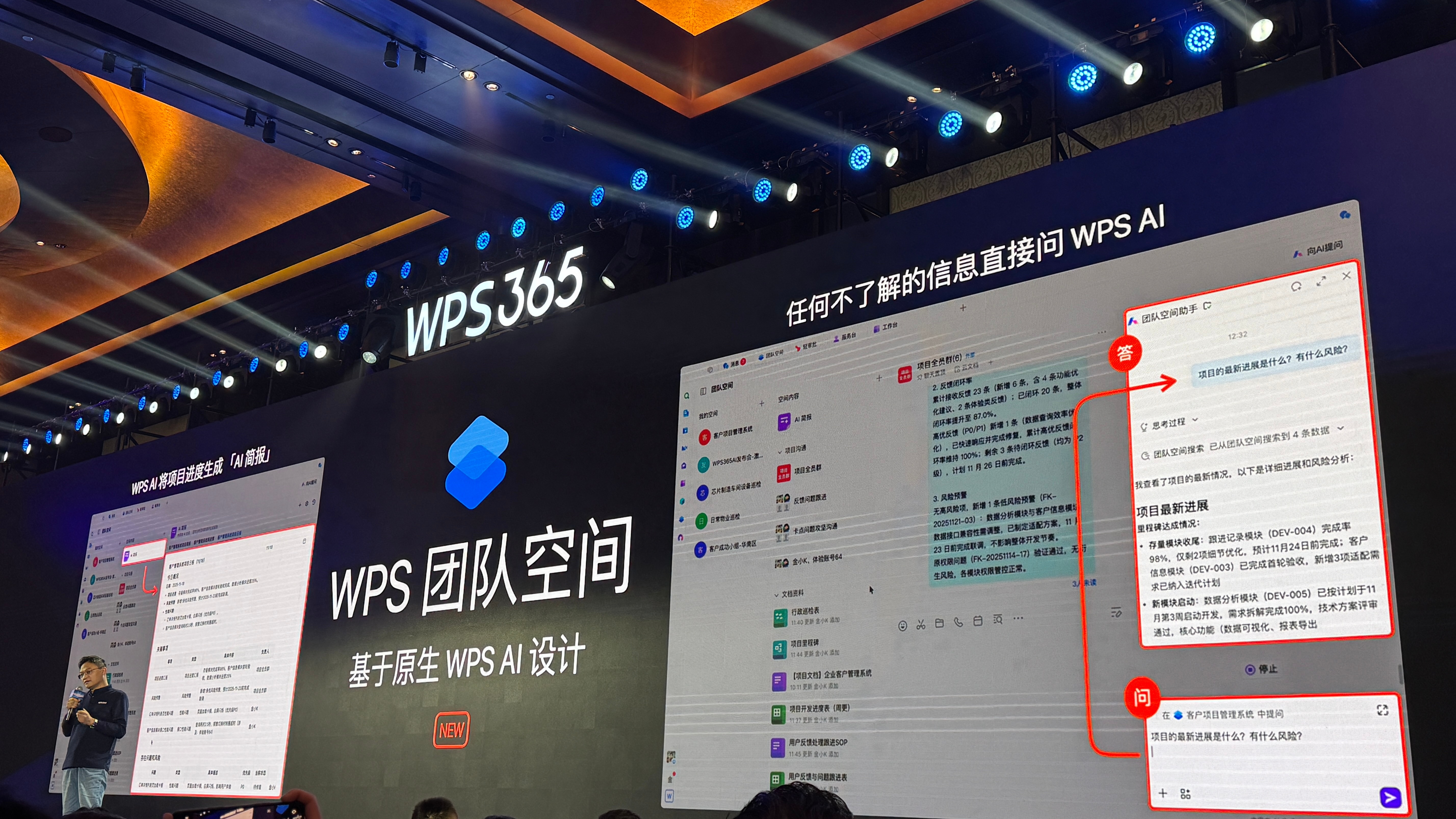 新产品WPS团队空间来了。你可以把它理解为一个一站式办公工作平台,你所有工作相关的信息全部集中在此。用AI将这些冗杂的信息利用起来,最高效地提取处理所需的信息。其实难点不在于数据,而是“企业数据”,例如一个医药企业对于数据的处理,有些AI可以总结,有些则需要人工反复确认。那这个流程怎么做?这就是一站式办公的必要性,入口统一,流程统一,数据的自动收集更有效率。再结合企业场景定制化,优化企业级搜索,让人与AI的协作更和谐。新模式引入了聊天模块,而且可以把AI助手拉进群聊,让它做总结复盘提醒发邮件等工作。同时每个人相当于有个数字员工分身,例如在你请假或者离职后,如果有人需要你处理的工作文档,那数字员工就会可以直接提供所需信息。