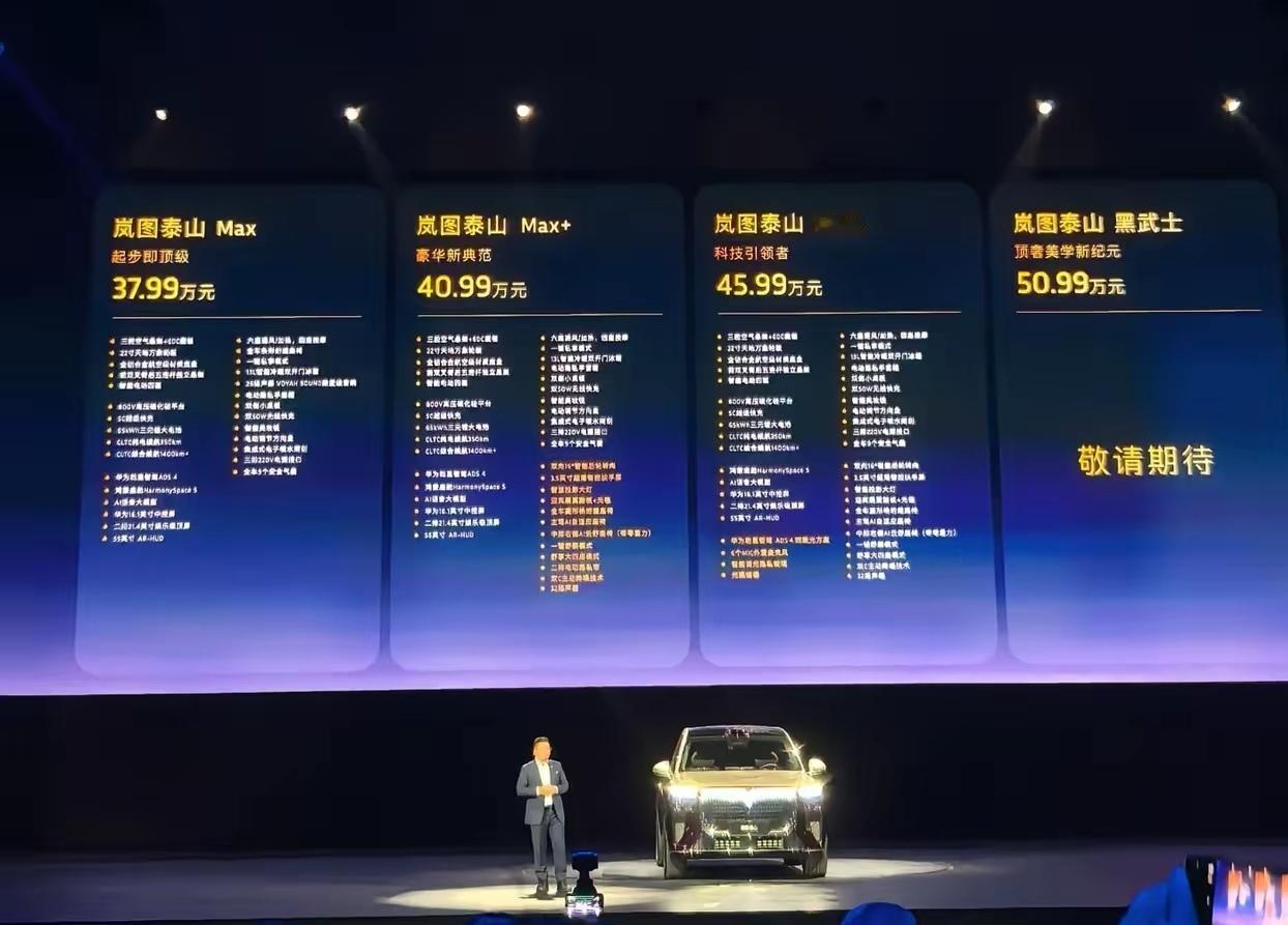 意不意外!都说最近市场最大的受益者就是岚图,岚图知音、岚图free+(岚图10月份交付17218辆),订单增长也很不错,所以这次华为都惊呆了! 11月18日,岚图泰山正式上市。 车身尺寸,长宽高分别是5230×2025×1817mm,轴距达3120mm,采用2+2+2六座布局。 智能方面,搭载华为乾崑ADS 4.0(4颗激光雷达+1000TOPS算力);鸿蒙座舱5.0(语音大模型+55英寸AR-HUD),具备L3级智能辅助驾驶能力。 动力系统,800V碳化岚海超混系统,CLTC纯电续航350km,综合续航1400km,支持5C超充(20%-80%充电12分钟) 说重点!岚图泰山售价区间为37.99万-50.99万,补齐岚图"三旗舰"矩阵(梦想家/追光L/泰山),冲击40万级豪华SUV市场! #大六座旗舰看岚图泰山#