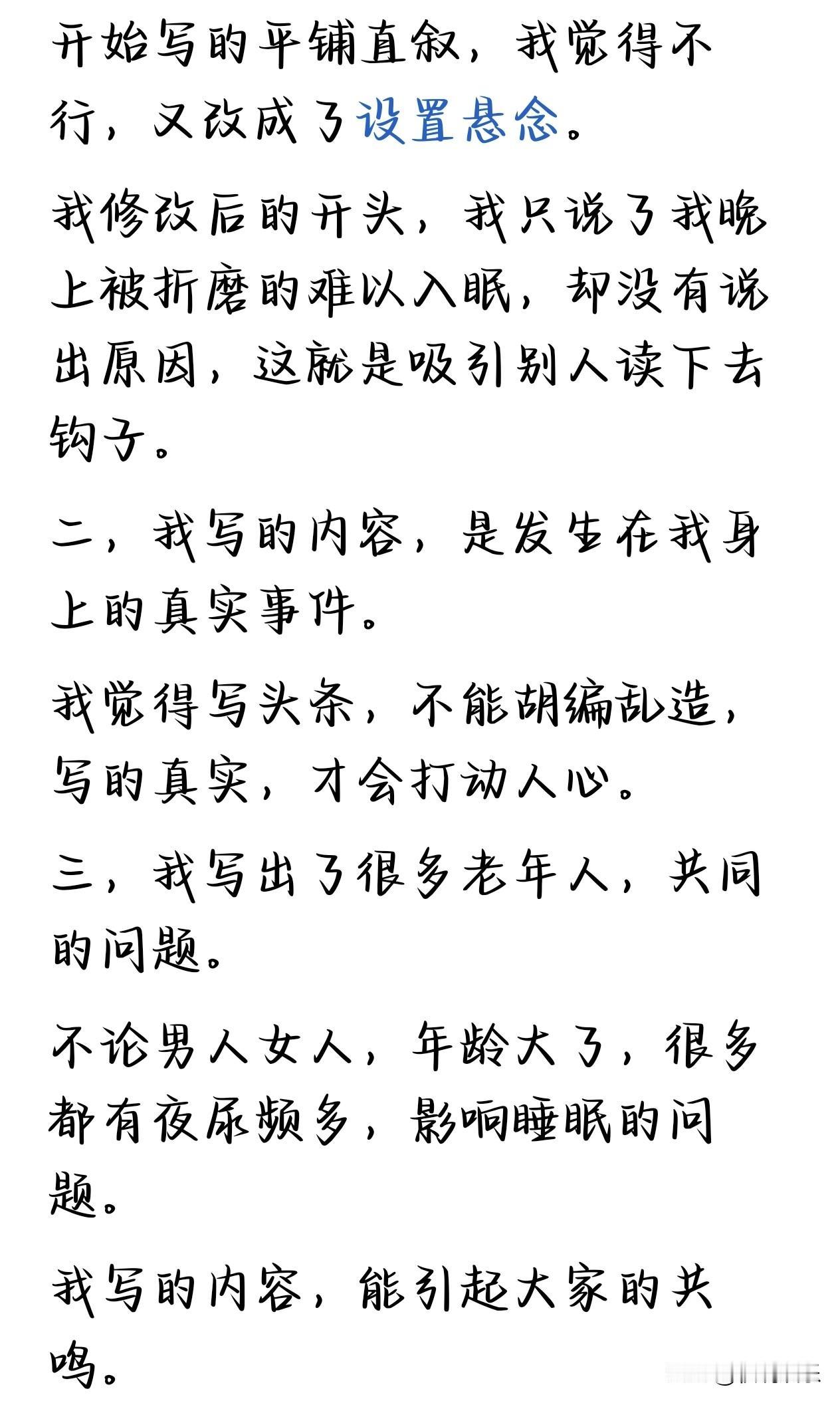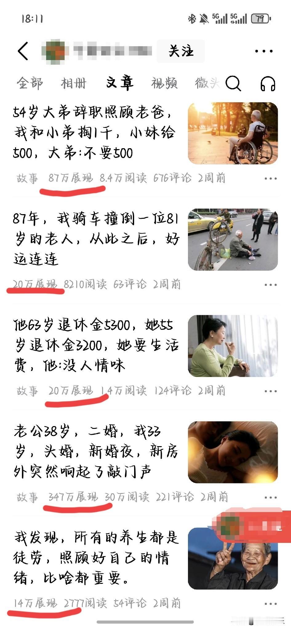 当我看到某作者写的爆款文章时,我是真的懵圈了!到底凭什么? 起先我是被他一条微头条吸引的,看点赞过500+,那展现和阅读也少不了, 埋头苦干走不通,我就想去学学别人的写作手法, 她说要真实,要有悬念,要写老年人的问题, ok,可我点进主页一看,我懵了! 这些爆款文章是怎么回事? 我都不想点进去看了,光看标题,确实满足悬念和老年群里, 可这些是真实吗? 文章标注是“故事”, 所以说,头条就是要写老年人爱看的家长里短的故事吗? 这微头条写下去没出路是吗?