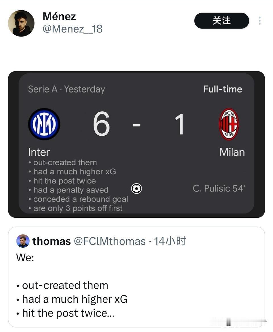 国际米兰6比1赢得米兰德比!我从来没有如现在这样真心佩服一个群体,这个事情过不去了,我错了,我认为国际米兰球迷说的都对,但我现在这样说也于事无补啊,这样吧,下次米兰德比我们赢了后,我就在家偷偷的乐,保证不发帖子了,这两天我一次一次去看比赛比分,我是真心想看清楚到底是谁赢了。 他们真的不是一个人,而是一个群体,他们会特别认真的和你说你到底看球没有,你们全场就那一次机会,你们全场都被压制,你们控球传球全方位落后,我们有两次门柱横梁,我们有一个没进的点球,你承认不承认国际米兰更应当获得比赛胜利。我只能说网络的普及是社会稳定的基础,没有网络这个群体会在公交站地铁站幼儿园干啥你敢想吗。 我总结下他们说的话,除了丢掉三分,国际米兰在本场做到了比你米兰更有创造力,竞技状态与水平更高,击中门柱两次,被扑了个点球,丢了个不该丢的球,国际米兰更应当获得比赛胜利,是米兰偷走了比赛的胜利,一贯的小偷作风。