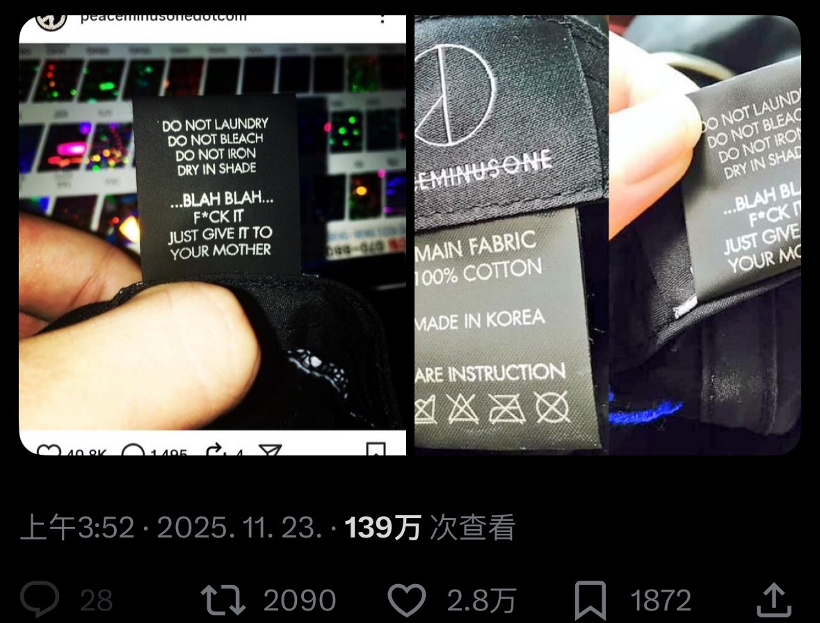 【twi】2.8万赞…权志龙品牌的衣标内容:“不要水洗、不要漂白、不要熨烫、阴干什么什么的……f*ck it直接丢给你妈就行了”