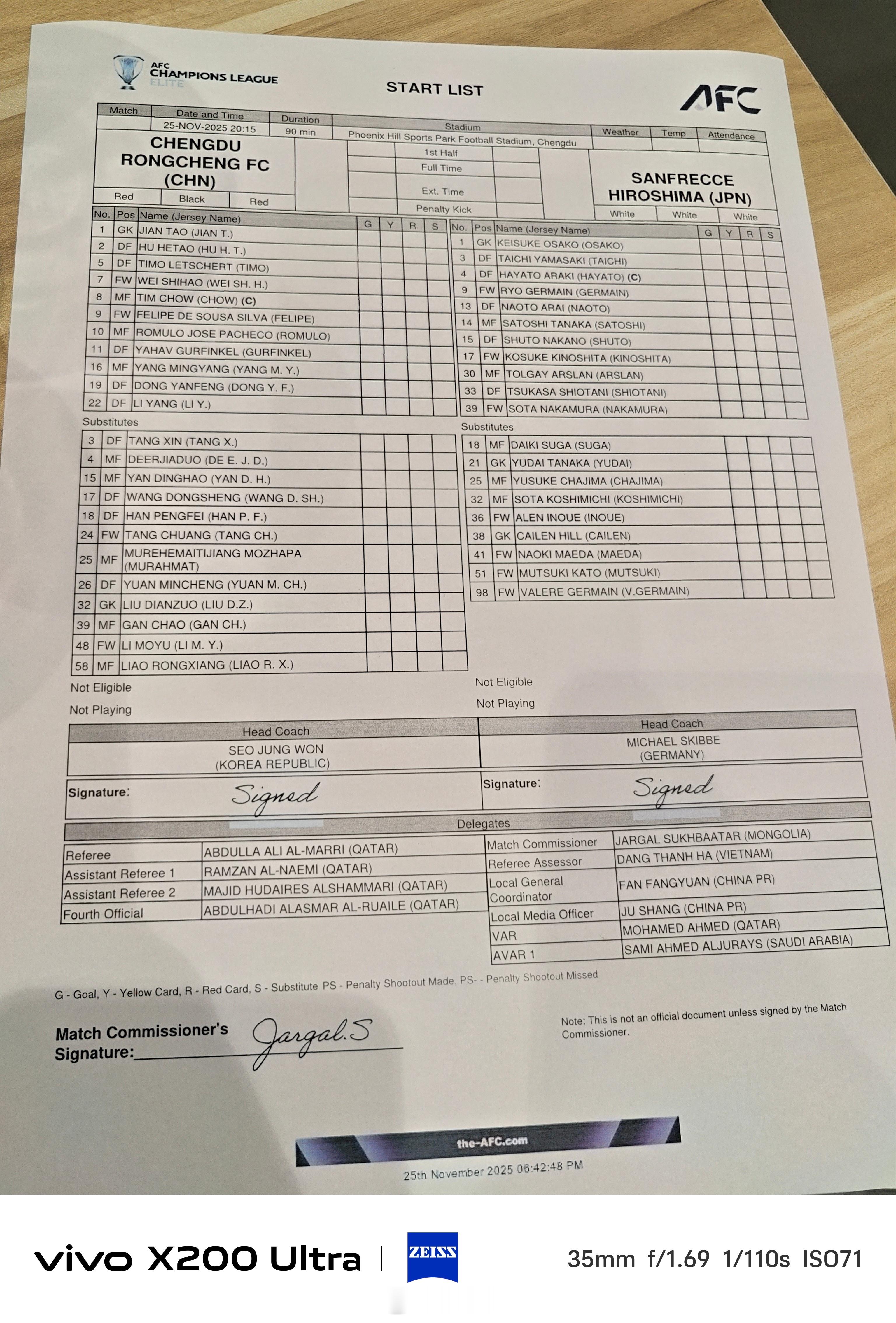 亚冠首发来了!成都蓉城首发:1-蹇韬、2-胡荷韬、5-提莫-莱切特、19-董岩鋒、22-李扬、11-古尔芬克尔、8-周定洋、10-罗慕洛、16-杨明洋、7-韦世豪、9-费利佩广岛三箭首发:1-大迫敬介、2-山崎大地、4-荒木隼人、13-新井直人、15-中野就斗、33-盐谷司、14-田中聪、30-阿尔斯兰、9-热尔曼-良、17-木下康介、39-中村草太