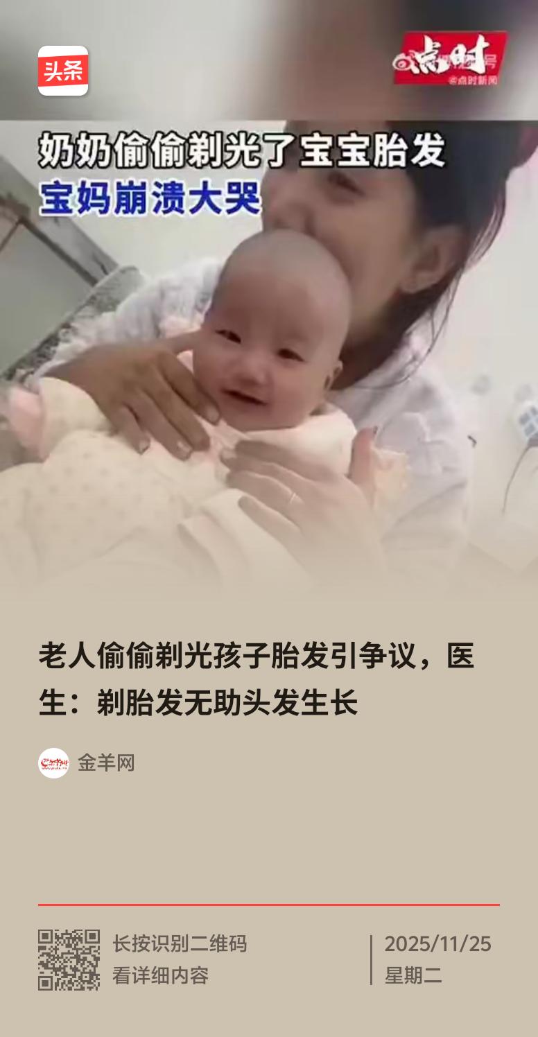 最近“老人偷偷剃光孩子胎发引争议”这事闹得挺火。11月23日,河南南阳的王女士发视频说,她出门不到20分钟,奶奶就趁这空当把50多天宝宝的胎发剃光了,她回家看到当场崩溃大哭1小时。王女士一直担心剃胎发损伤宝宝毛囊,而且宝宝原本发质挺好。奶奶是坚持老一辈观念,觉得不剃胎发孩子易生病。王女士平时也留意防范了,还是没防住。不过最后她还是原谅了奶奶,毕竟奶奶出发点是爱宝宝,只是育儿方式有分歧。家家都可能有这种情况,互相理解心意才是关键。