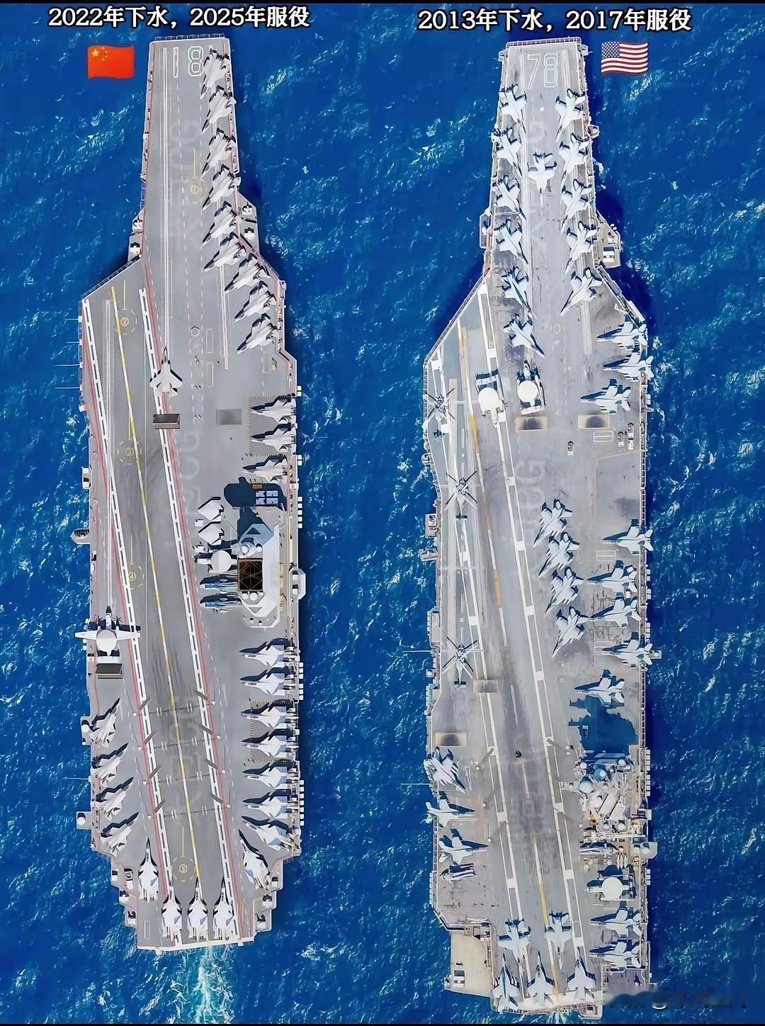 福建舰和福特级航母差的不是一点点,本以为舰岛后移,就能实现福特号甲板的利用率。 通过这张对比图来看,两艘航母最大的还是吨位,以及甲板的长度和宽度。 在没有航母的年代,我们称呼纸老虎的航母叫移动靶子,现在有了叫国之重器。