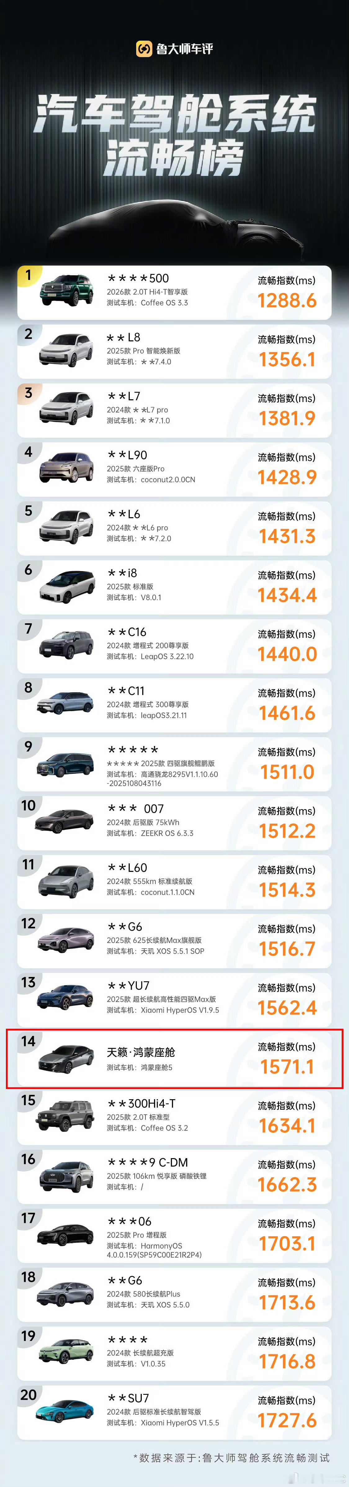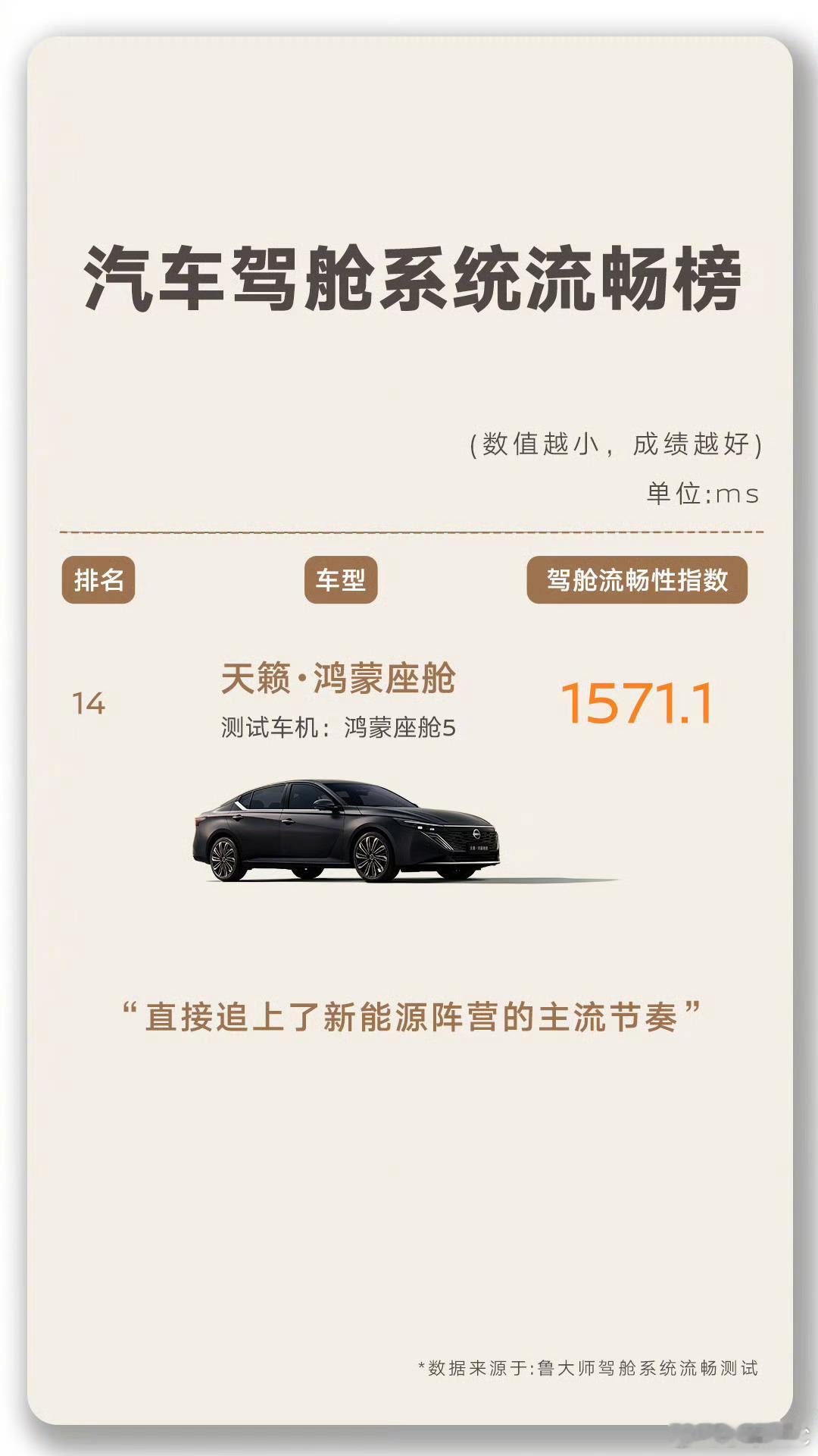 燃油车“智能洼地”标签要被掀翻了!鲁大师这次给出的数据非常有意思啊天籁·鸿蒙座舱作为榜单里最扎眼的燃油车,用三组硬核数据把“油车不智能”的偏见按在地上摩擦——导航规划响应510.42毫秒、座椅调节时延106.67毫秒,两项均拿下全场第一,应用滑动102.5毫秒更是追平主流新势力,这哪是“补课”,分明是直接“跳级”!以前总说“要智能就得选电车”,现在天籁·鸿蒙座舱用排名14的成绩证明:决定车够不够智能的,从来不是动力形式。当“移动大沙发”装上鸿蒙“超脑”,燃油车终于在智能赛道上跑出了属于自己的加速度!你觉得这波测评会让更多人放弃续航焦虑,选择智能燃油车吗?评论区聊聊~