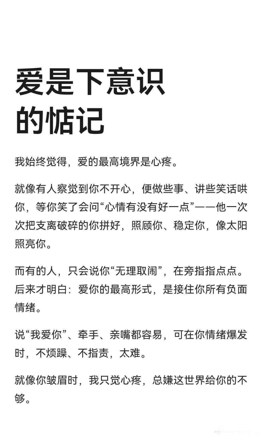 爱是下意识的惦记 我不善言辞,但你的行动永远是我被偏爱的最好证明 我始终觉得,爱的最高境界是心疼。 就像有人察觉到你不开心,便做些事、讲些笑话哄你,等你笑了会问“心情有没有好一点”——他一次次把支离破碎的你拼好,照顾你、稳定你,像太阳照亮你。 而有的人,只会说你“无理取闹”,在旁指指点点。后来才明白:爱你的最高形式,是接住你所有负面情绪。 说“我爱你”、牵手、亲嘴都容易,可在你情绪爆发时,不烦躁、不指责,太难。 就像你皱眉时,我只觉心疼,总嫌这世界给你的不够。 “我始终觉得,爱是下意识的惦记,是潜意识的偏爱,也是毫无理由的护短。”
