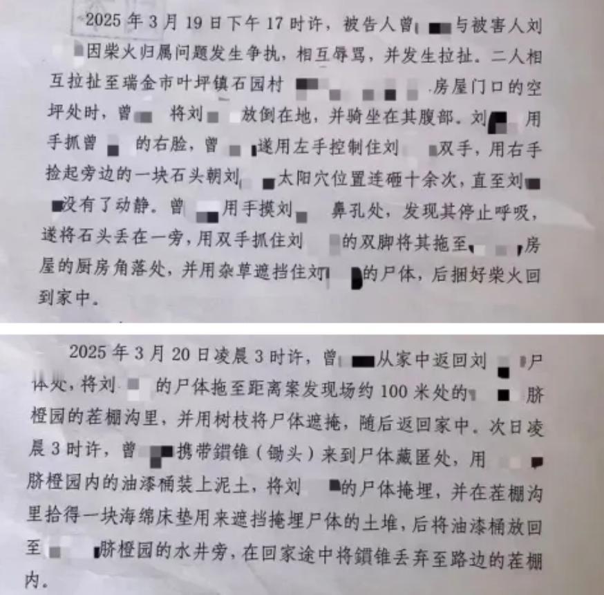 好狠的邻居!江西瑞金,一74岁老太偷取73岁女邻居家的柴火,被发现后两人发生争吵,不料,老太竟直接对女邻居痛下杀手,邻居女儿得知后要求判处老太死刑,可警方回答却令人意外。 曾老太和刘老太是相处了几十年的邻居,谁也无法相信曾老太居然会做出如此禽兽之举。 事情发生在今年3月19日傍晚,曾老太又到了刘老太家门口,准备偷取刘老太家的柴火,此前几次想偷都被刘老太制止了。 这次依然被刘老太听到了动静,两人发生了激烈争吵,在曾老太看来,柴火又不值钱,拿点烧火没什么大不了,可刘老太也节省惯了,自然不愿意别人随便拿她的东西。 两人吵着吵着就打了起来,刘老太个子只有一米五多点,显然不是曾老太的对手,可她也不服软,顽强抵抗。 正在气头上的曾老太随即抄起旁边的石头朝着刘老太的太阳穴狠狠砸去,砸了十几下之后刘老太就没了呼吸。 曾老太先是把刘老太的尸体放在了一处空屋内,第二天凌晨3点就扛着锄头将刘老太拖到了一处野外空地掩埋,为了掩人耳目,刘老太还在掩埋处盖了一个破旧的海绵垫。 事后,曾老太背着柴火回到了家中,一点都不感到紧张。 但若想人不知,除非己莫为,就在一周之后警方还是找上了门。 原来,刘老太有两个女儿,大女儿毛女士之前来回老家看望过母亲,一连几天打电话都没人接,就专门赶了回去,刘老太的老伴说没见到刘老太的身影,可能去了二女儿家。 毛女士又给妹妹打了电话,结果发现刘老太没在她那里,眼看人已失踪多日,毛女士直接就报了警。 警方随即调取了村里的监控,发现刘老太最后一次出现就是在3月19日傍晚,而在她出现过的地方曾老太也几乎同一时间出现。 警方随即对曾老太进行了审讯,曾老太直接供述了犯罪经过。 更让警方没想到的是,曾老太不仅没有试图抵赖,反而一直嚷嚷着刘老太该死,还说“她不禁打”,都是乡里乡亲,警方也无法理解曾老太居然会为了一捆柴火就敢直接杀人。 毛女士得知事情真相后十分愤怒,她只想让法院判处曾老太死刑,杀人偿命,她要给母亲讨一个公道。 可警方却说曾老太已经年过7旬,又没有实际的证据证明她杀了人,恐怕很难符合死刑的标准。 目前,该案件正在已故意杀人罪处理当中,法院将择期宣判。