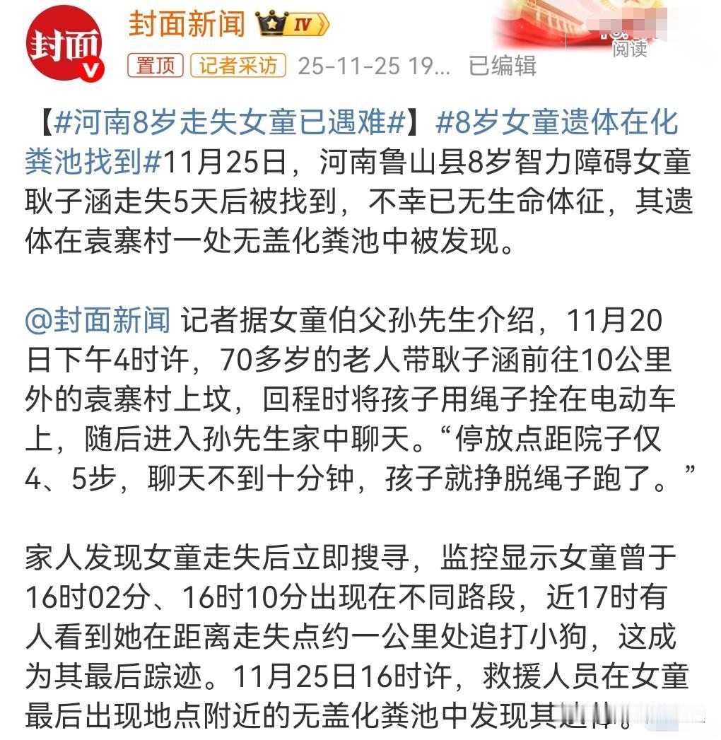 这真的是太悲剧了。 11月25日消息,河南8岁走失女童已遇难,掉到化粪池里面身亡了。 有人怀疑家属是故意为之。 家属称就是因为不放心在家才带出来的。 当时是带孩子去上坟,老人和别人聊天,把孩子锁在车边,孩子挣脱后走失。 这真是太大意了。