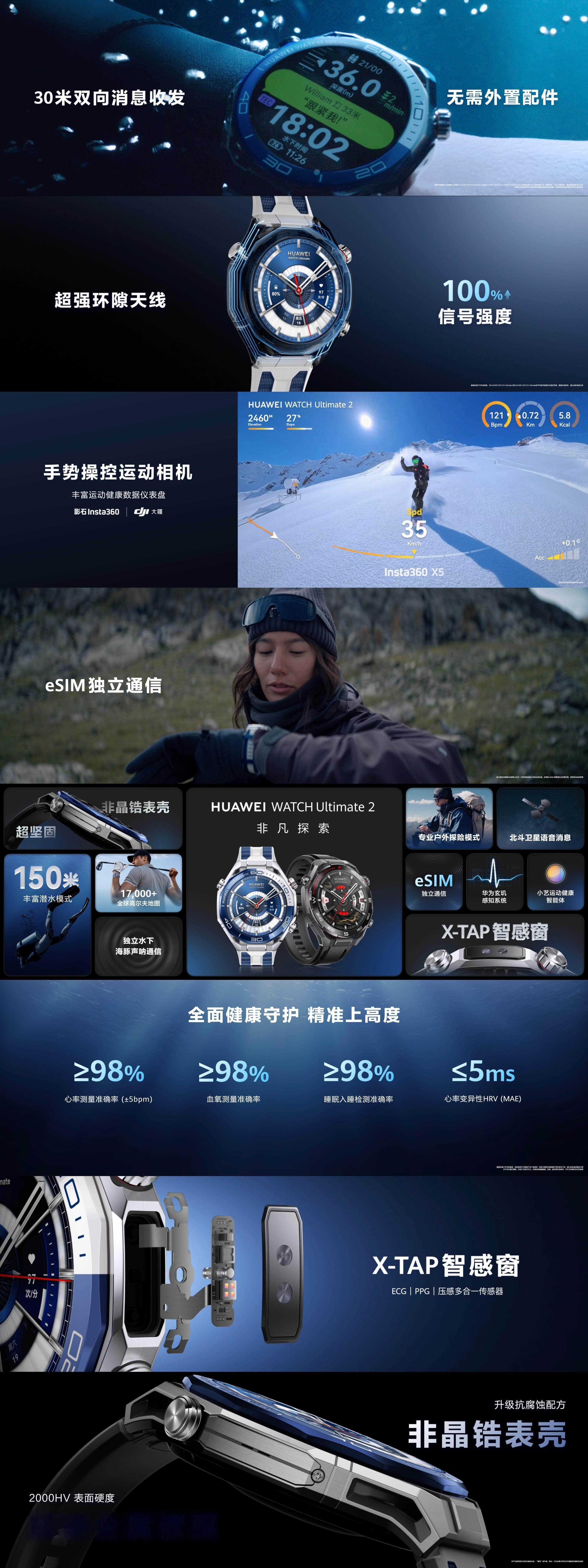 期待已久的华为WATCH Ultimate 2 非凡探索终于要来了!子弹兄得知的消息是,这会是华为迄今最强大的旗舰智能腕表!它采用高端时尚设计的同时,配置和功能体验也都强很离谱。华为手表首发腕上鸿蒙智能体,它首发了150米潜水模式,通过了ISO 22810防水能力及ISO6425、EN13319潜水能力双重认证。不仅如此,业界首发北斗卫星语音消息的同时,它还首发搭载了手表水下独立通信功能,配合Esim独立通信和AI通话降噪能力,以及向日葵定位系统,通信能力也是塔尖的存在。我还很喜欢它的X-Tap智感窗和智慧体验。内置ECG、PPG、压力三大传感器,可以进行指尖血氧检测,支持高血压、血糖、冠心病和卵巢风险评估,健康功能和体验也都非常专业且丰富。智慧体验方面,手势操控接电话/关闹钟/拍摄照片,还可以手势开尊界s800的车门,真的太智能太方便了。外观和材质方面,华为WATCH Ultimate 2 非凡探索也是用料十足、诚意满满的。非晶锆合金+超硬镀膜的表壳,双色纳米微晶陶瓷材质的表圈,还有蓝宝石玻璃表镜,耐划和耐腐蚀的属性拉满。这么看来,华为WATCH Ultimate 2 非凡探索这款手表真的没有任何短板了,叫它“华为表王”应该是实至名归了吧!