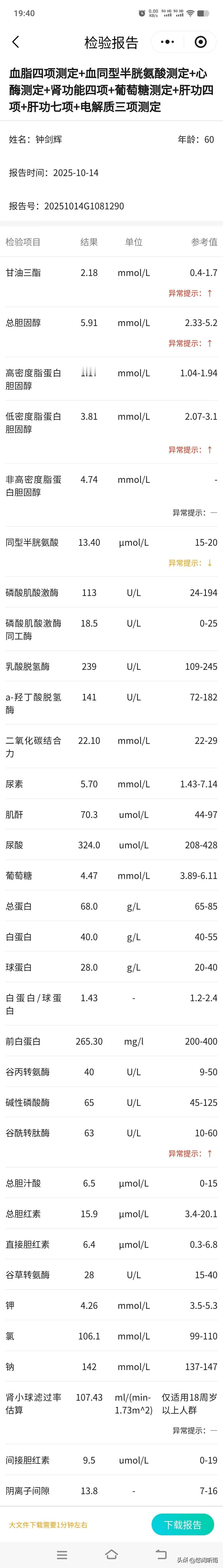 60岁血脂轻度高,别慌!老医生同学教我“不吃药调血脂” 我今年60岁,前阵子体检查出甘油三酯、总胆固醇、低密度脂蛋白都轻度偏高,心里有点慌,赶紧找当医生的老同学看报告。 他看完笑说:“都是临界高,不用急着吃药,先调生活习惯!” 他太懂我——平时爱喝酒吃肉、每天步数才一两千。他说:“控制饮食不是饿肚子,把五花肉换成清蒸鱼、白米饭掺燕麦,每天一个鸡蛋、一杯奶,蔬菜换着吃,营养够还控脂。” 运动上他让我别贪多,每天大步走五六千步、走到出汗就行,循序渐进别累着。 他还特意叮嘱:“60岁肝肾代谢慢,能靠生活调就别吃药,真降不下来再找我,现在急着吃反而伤身体。” 我按他说的坚持了一个月,感觉精神都好了不少,过几天复查看看效果。 其实咱们这个岁数,血脂轻度高很常见,别一看到箭头就慌着吃药,先试试管住嘴、迈开腿——毕竟身体是自己的,稳着来才是真健康。