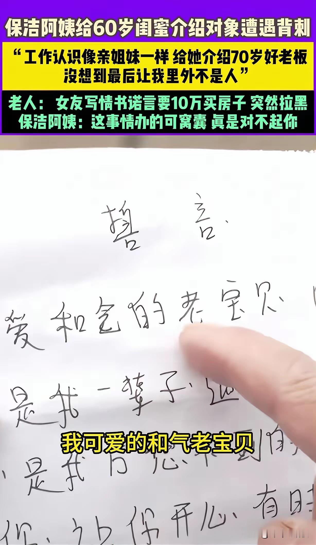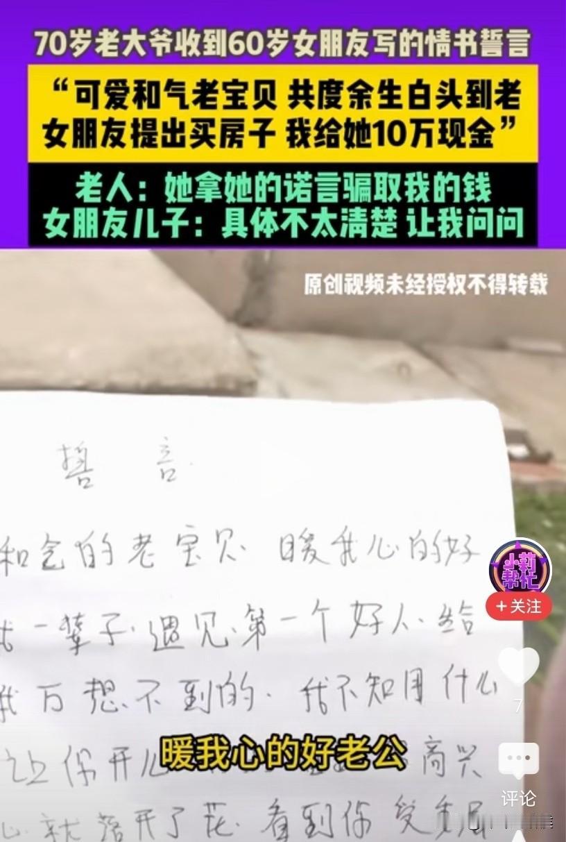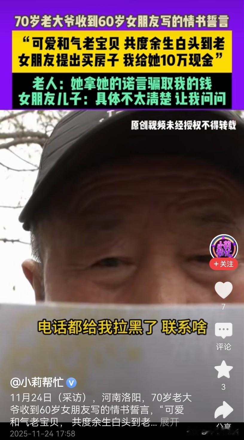 河南洛阳,一位70岁老板怎么也没想到,自己居然会中招,他被刚谈不久的女友一份肉麻的情书给骗了,一句“我可爱的老宝贝”背后,却是拿走10万元拍拍屁股走人,把老人给拉黑了。 他们之间到底发生了什么呢? 原来这位七旬的大爷,身份也算是个小老板,虽然人老但心不老,他坦言也想谈一份轰轰烈烈的爱情。 他手下的一个员工李女士想着自己的闺蜜也是单身,两人年纪相仿,说不定还能凑成一块过日子。 于是就把闺蜜介绍给了老板,大爷一看是自己员工介绍的,算是知根知底了。 两人一见面,还真对上眼了,经过一段时间的相处,两人都挺满意,女方表示将来不想跟儿女们过,想有个房子跟大爷一起度过余生,期间还给大爷写了一份情书。 情书有多肉麻,不仅说大爷是大宝贝,好老公,还是她一辈子遇见的第一个好人,就想着跟大爷好好过一生…… 老人看了情书以后,激动之余也就放松了警惕,虽然两人没领证,但早已将对方当成了自己的另一半。 后来,这个闺蜜提出了想要属于两人的小屋时,老人没有怀疑就给闺蜜转去了10万元,也正是因为这个10万元,事件来了个180度大拐弯,她只说了一句要去北京打工,就消失不见了。 等到老人再打电话联系时,发现居然联系不上了,还把自己给拉黑了,这时候老人清醒了:情话再甜,也抵不过金钱。 大爷那段时间把自己都气病了,说她拿着诺言骗他的钱,而这位介绍人也觉得非常委屈,没想到她闺蜜是这样的人,看来熟人介绍,并非万无一失,更难预判对方的心思。 这才有小莉帮忙过来进行调解,后来打给了老人的儿子,希望能够联系上“她”,而她儿子回应:自己也不太清楚,要回去问一问。 这起事件,也告诉我们老年朋友,哪怕是老年婚恋,也别为爱冲昏了头脑,自己的养老钱更要守住,真正的爱情,是经得起“丑话说在前头”。 当然了,这位大爷也没有默默吃哑巴亏,首先选择了报警,这一步做得非常对。 同时,他也敢于站出来指责,不仅有可能挽回损失,也避免更多的人上当。