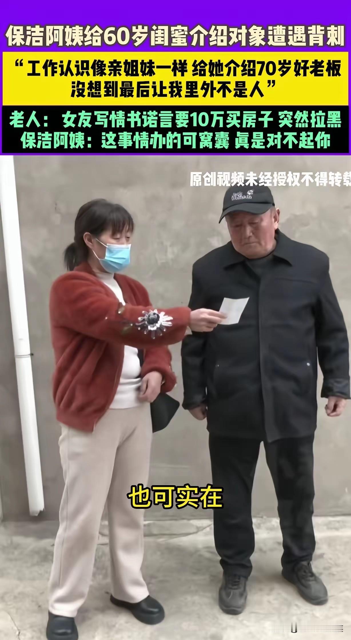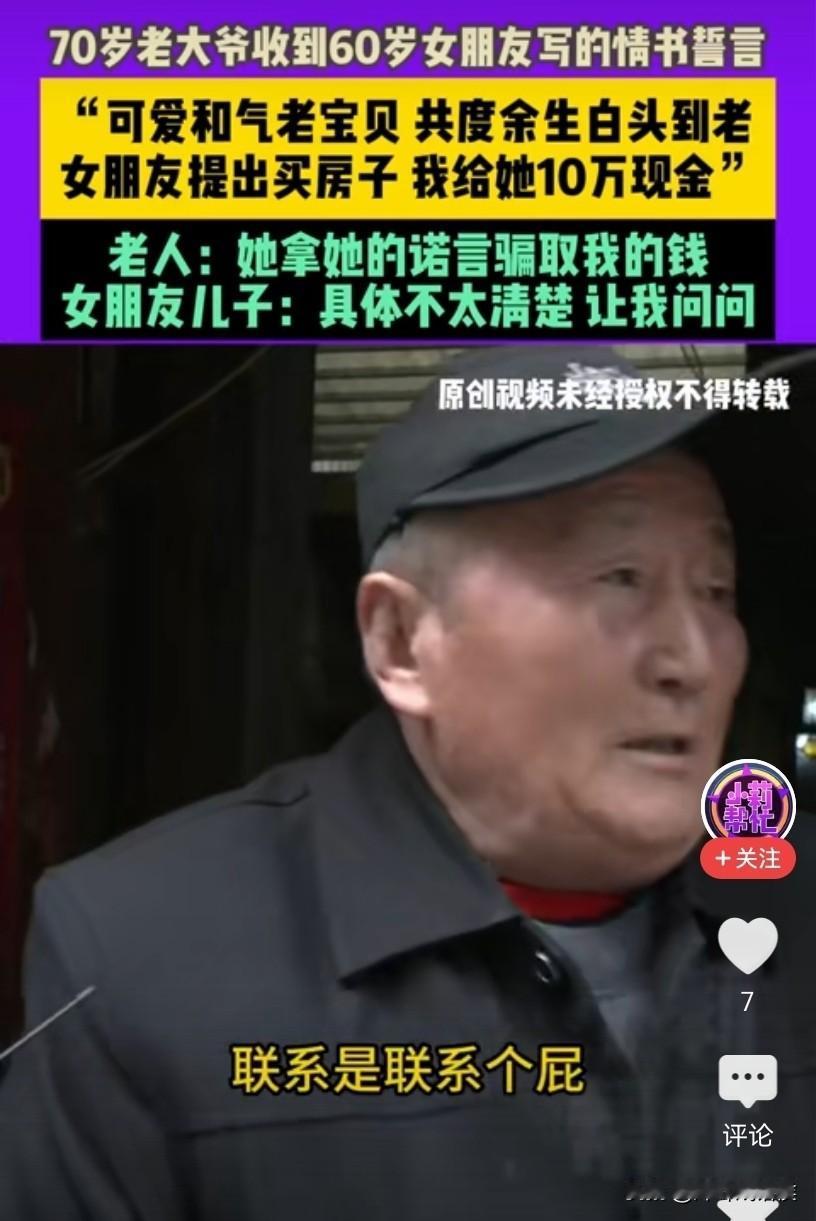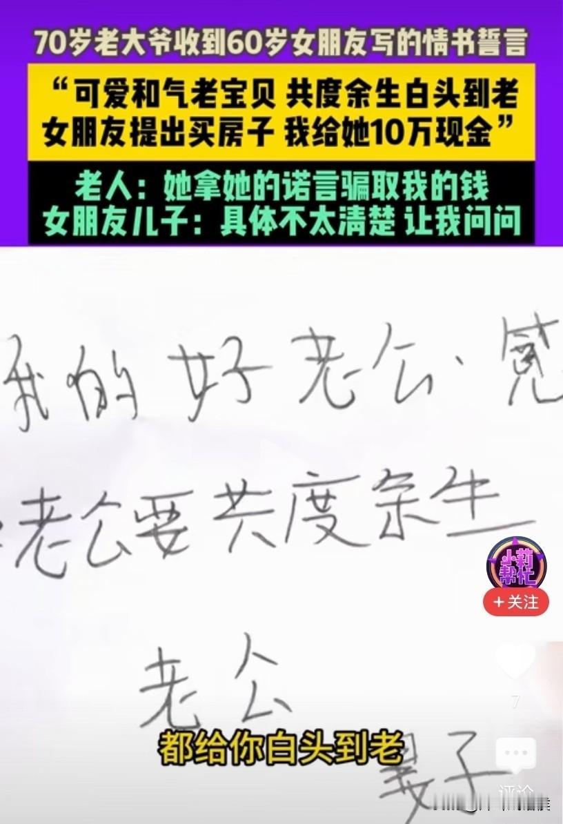 河南洛阳,一位70岁老板怎么也没想到,自己居然会中招,他被刚谈不久的女友一份肉麻的情书给骗了,一句“我可爱的老宝贝”背后,却是拿走10万元拍拍屁股走人,把老人给拉黑了。 他们之间到底发生了什么呢? 原来这位七旬的大爷,身份也算是个小老板,虽然人老但心不老,他坦言也想谈一份轰轰烈烈的爱情。 他手下的一个员工李女士想着自己的闺蜜也是单身,两人年纪相仿,说不定还能凑成一块过日子。 于是就把闺蜜介绍给了老板,大爷一看是自己员工介绍的,算是知根知底了。 两人一见面,还真对上眼了,经过一段时间的相处,两人都挺满意,女方表示将来不想跟儿女们过,想有个房子跟大爷一起度过余生,期间还给大爷写了一份情书。 情书有多肉麻,不仅说大爷是大宝贝,好老公,还是她一辈子遇见的第一个好人,就想着跟大爷好好过一生…… 老人看了情书以后,激动之余也就放松了警惕,虽然两人没领证,但早已将对方当成了自己的另一半。 后来,这个闺蜜提出了想要属于两人的小屋时,老人没有怀疑就给闺蜜转去了10万元,也正是因为这个10万元,事件来了个180度大拐弯,她只说了一句要去北京打工,就消失不见了。 等到老人再打电话联系时,发现居然联系不上了,还把自己给拉黑了,这时候老人清醒了:情话再甜,也抵不过金钱。 大爷那段时间把自己都气病了,说她拿着诺言骗他的钱,而这位介绍人也觉得非常委屈,没想到她闺蜜是这样的人,看来熟人介绍,并非万无一失,更难预判对方的心思。 这才有小莉帮忙过来进行调解,后来打给了老人的儿子,希望能够联系上“她”,而她儿子回应:自己也不太清楚,要回去问一问。 这起事件,也告诉我们老年朋友,哪怕是老年婚恋,也别为爱冲昏了头脑,自己的养老钱更要守住,真正的爱情,是经得起“丑话说在前头”。 当然了,这位大爷也没有默默吃哑巴亏,首先选择了报警,这一步做得非常对。 同时,他也敢于站出来指责,不仅有可能挽回损失,也避免更多的人上当。
