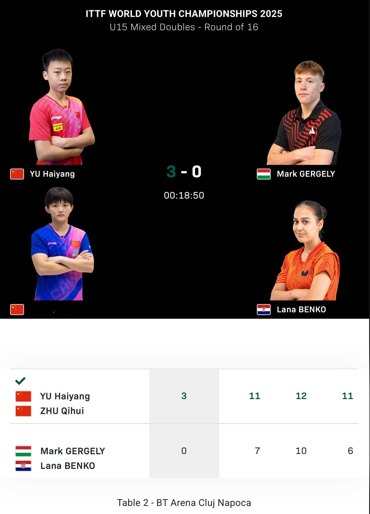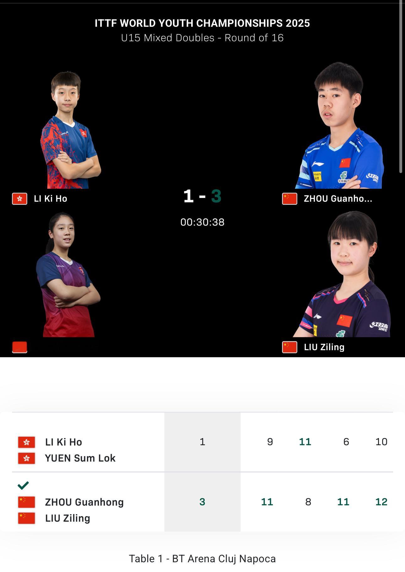 2025世青赛U15混双16-8周冠宏/刘子菱3-1黎骐豪/阮芯诺于海洋/祝启慧3-0格尔格利/本科8-4周冠宏/刘子菱VS大林飒真/村松心菜 于海洋/祝启慧VS李承株/许玴玪