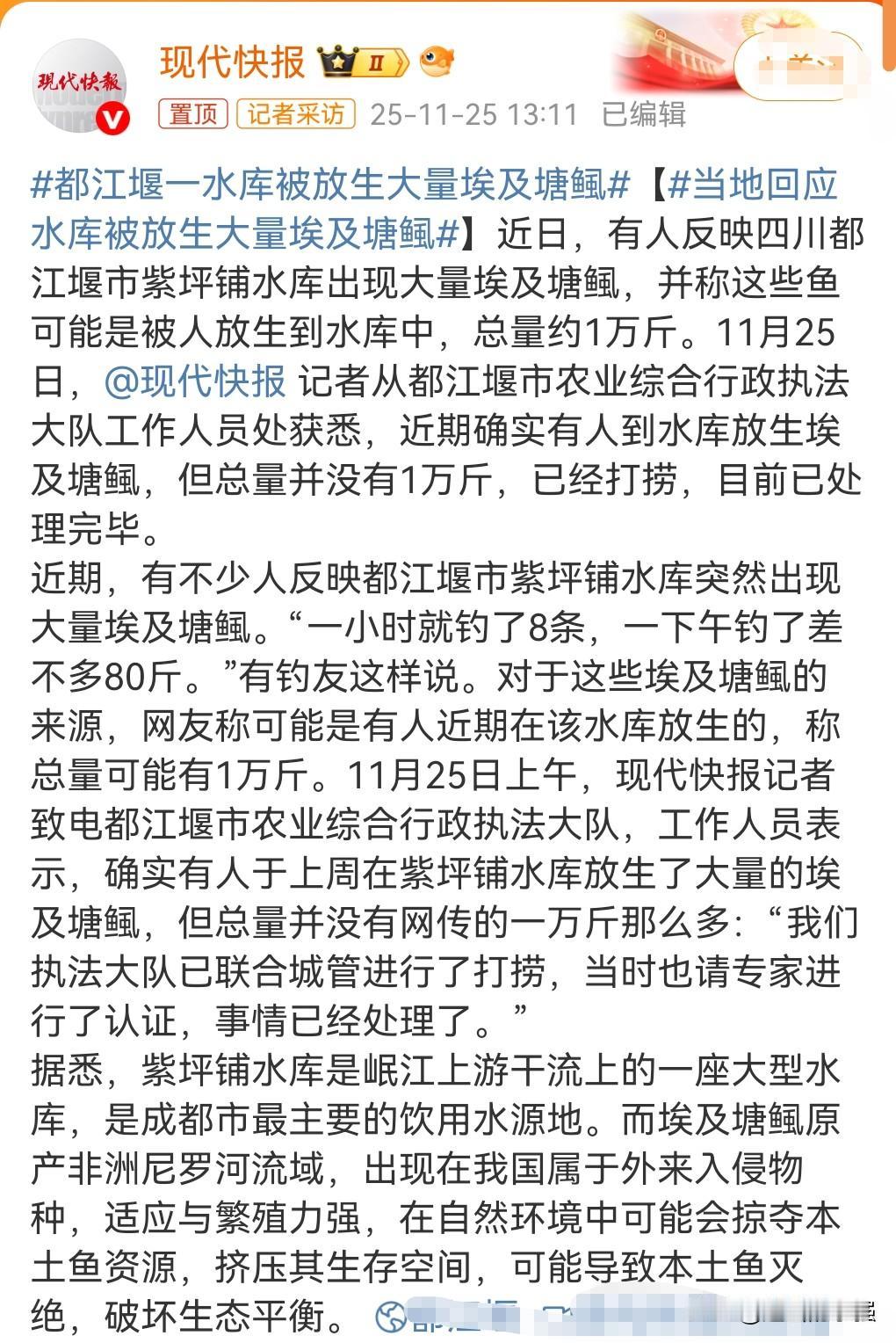 这真是害人不浅啊,近日有人反映,都江堰一水库被放生大量埃及塘鲺,这可是未来物种啊,看上去个头很大。 生存和繁殖能力强。 可能导致本土鱼灭绝。 网传说有1万斤,不过当地进行了否认。 外来物种非常的可怕,总是有一些放生外来物种的新闻。 真是防不胜防。