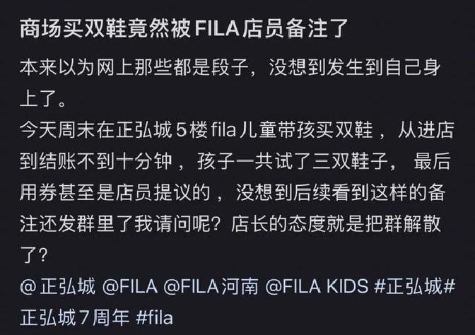 郑州有位妈妈,最近在FILA童装店的遭遇可真是让人窝火!上个月23号,她在正弘城FILA店里给孩子选鞋,前后不到十分钟就挑好了一双,结账时店员还主动提出用券,一切看起来都挺顺利。 可没过多久,当这位妈妈被拉进店家的会员群时,赫然发现店员给她的客户备注上,竟然写着“买双鞋子都嫌贵”这样的字眼。这下可把她气得不轻,直接在群里质问店员,这消息一出,群里其他顾客也纷纷表示不满。虽然店长随后出来道歉,解释说这是为了“更细致”地了解顾客需求,但显然这种解释没能平息大家的怒火。 事情闹大后,FILA官方也很快出面,表示已经了解情况,会对涉事员工进行严肃处理,并承诺会提升服务水平,希望能亲自向顾客致歉。 这起事件再次敲响了警钟:在如今这个讲究个性化服务和信息保护的时代,消费者对品牌的要求越来越高。零售企业在收集和使用客户信息时,必须严格遵守职业道德,确保顾客隐私和感受得到充分尊重。斐乐(FILA)作为一个有实力、背靠安踏的知名品牌,其母公司注册资本高达五千万,本应在服务细节上做得更加严谨。要知道,即便这样的大品牌,也并非没有过合同纠纷等法律问题,这更提醒企业在日常运营中,每一个环节都不能掉以轻心。数字化时代,一个细节上的疏忽,就可能给品牌形象带来难以挽回的损失,赢得顾客的信任才是品牌立足长远的关键