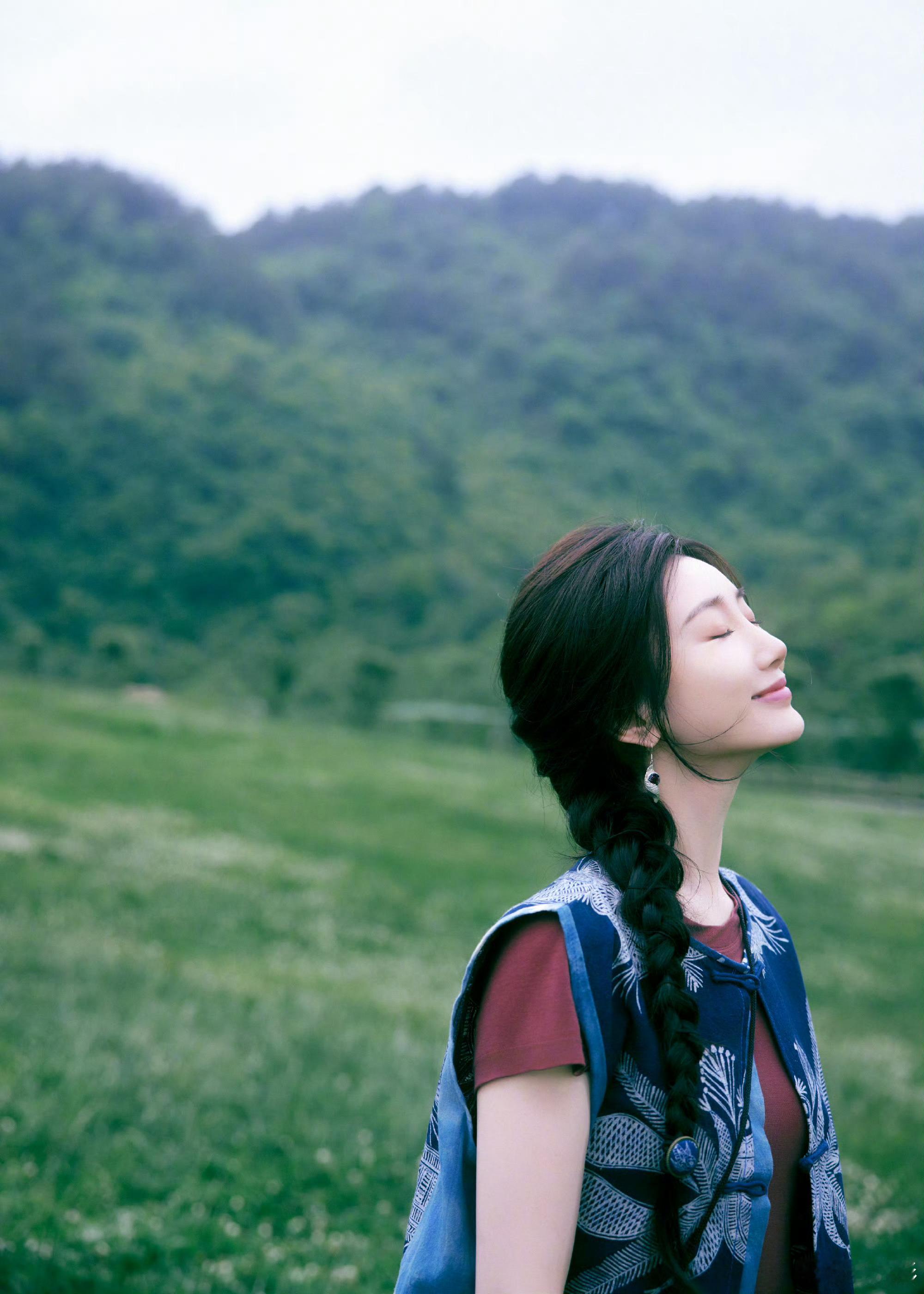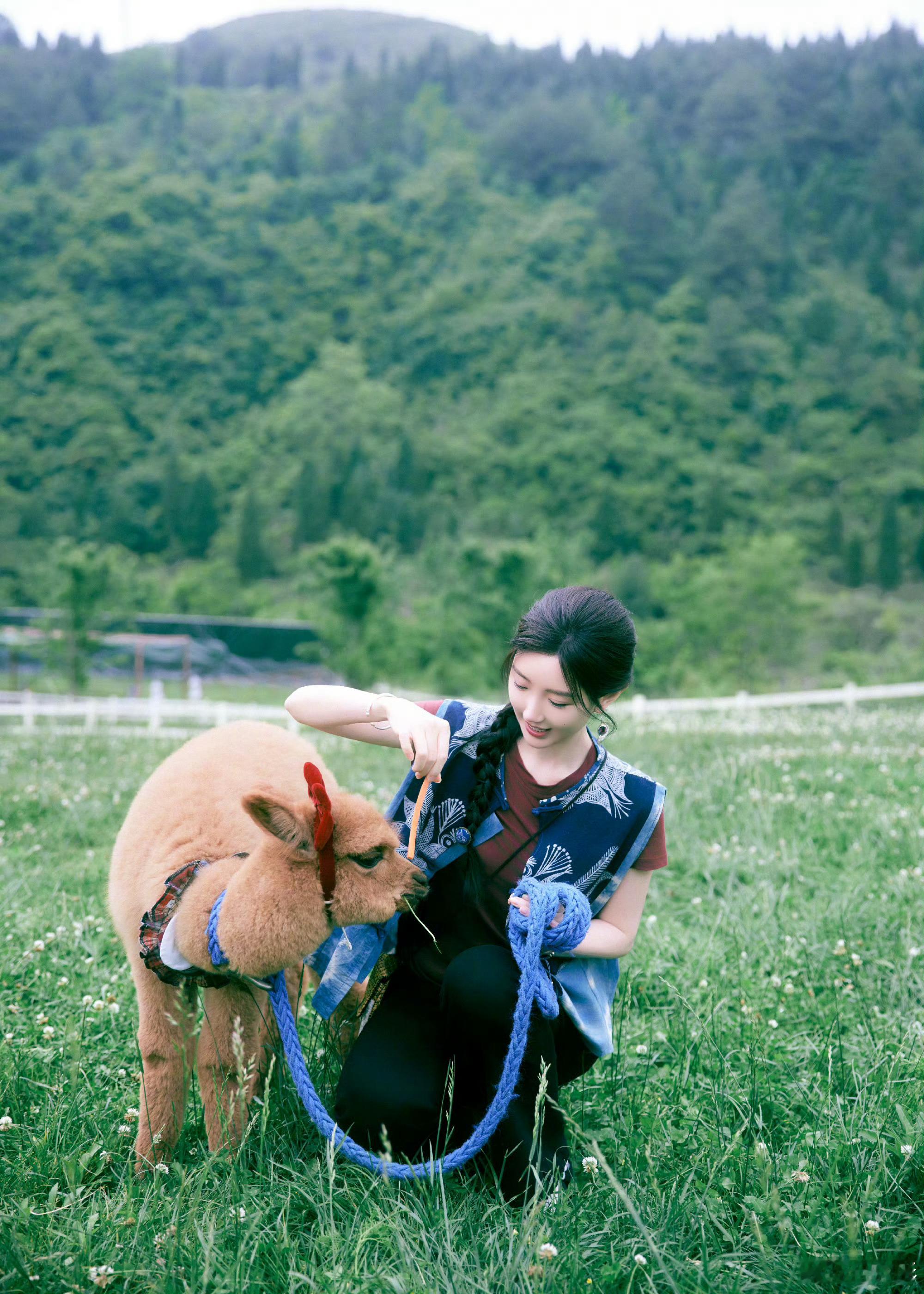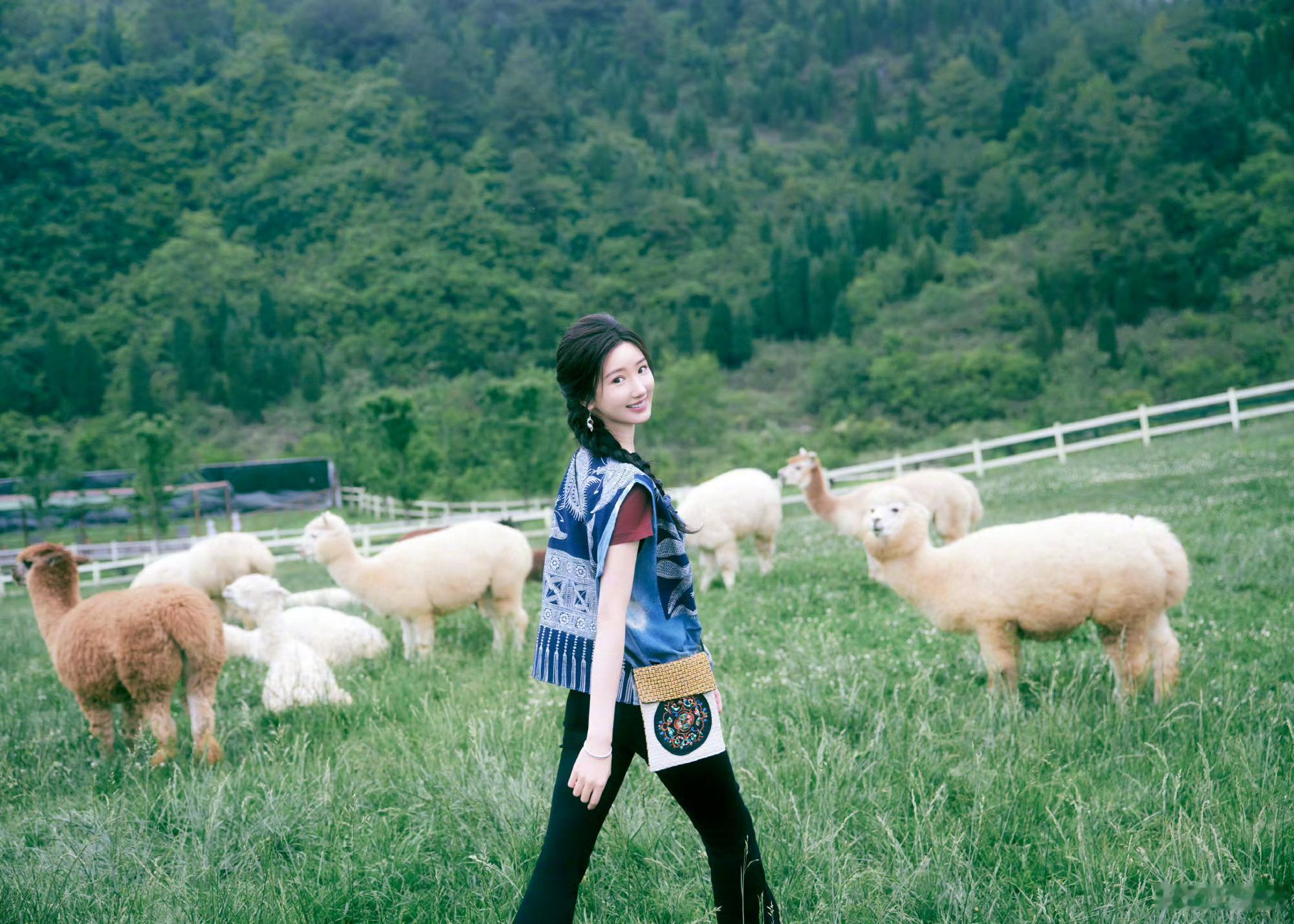 分享照片🌲蓝染背心配麻花辫,和这一片青绿好适配田园风让人看了好治愈,想魂穿被姐姐牵着的小羊
