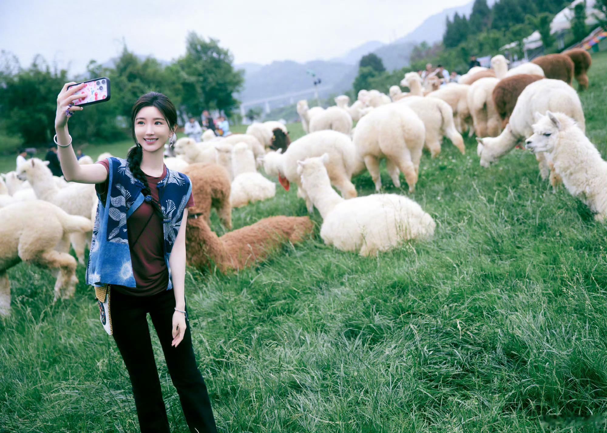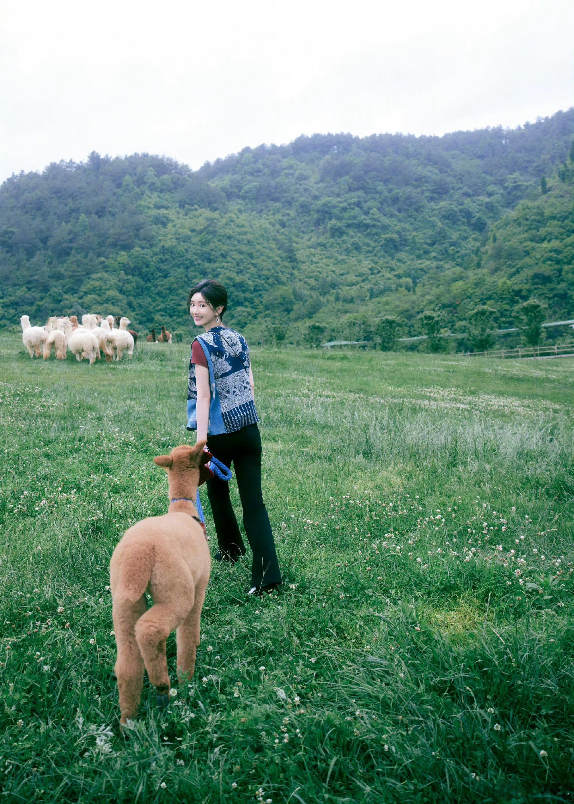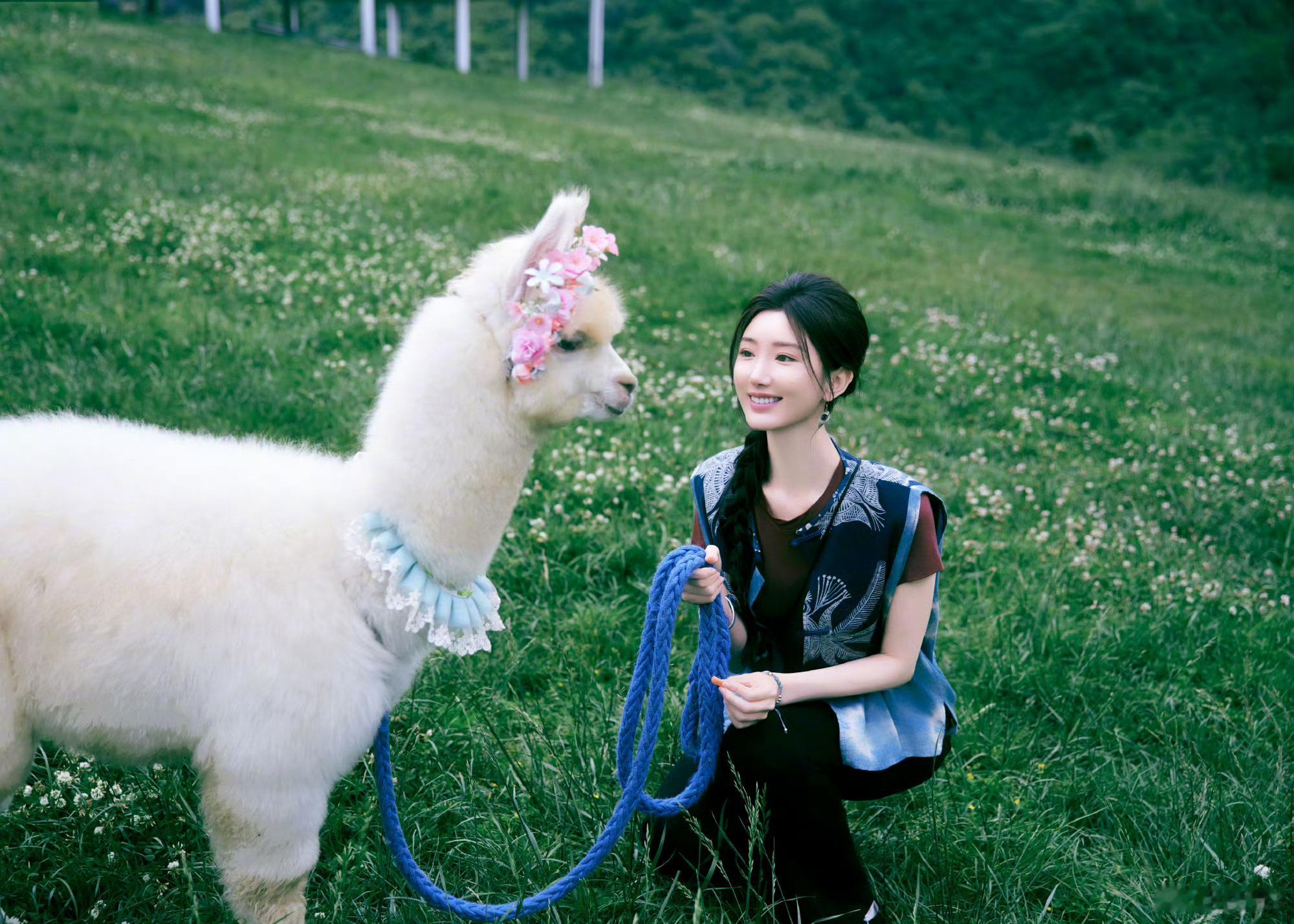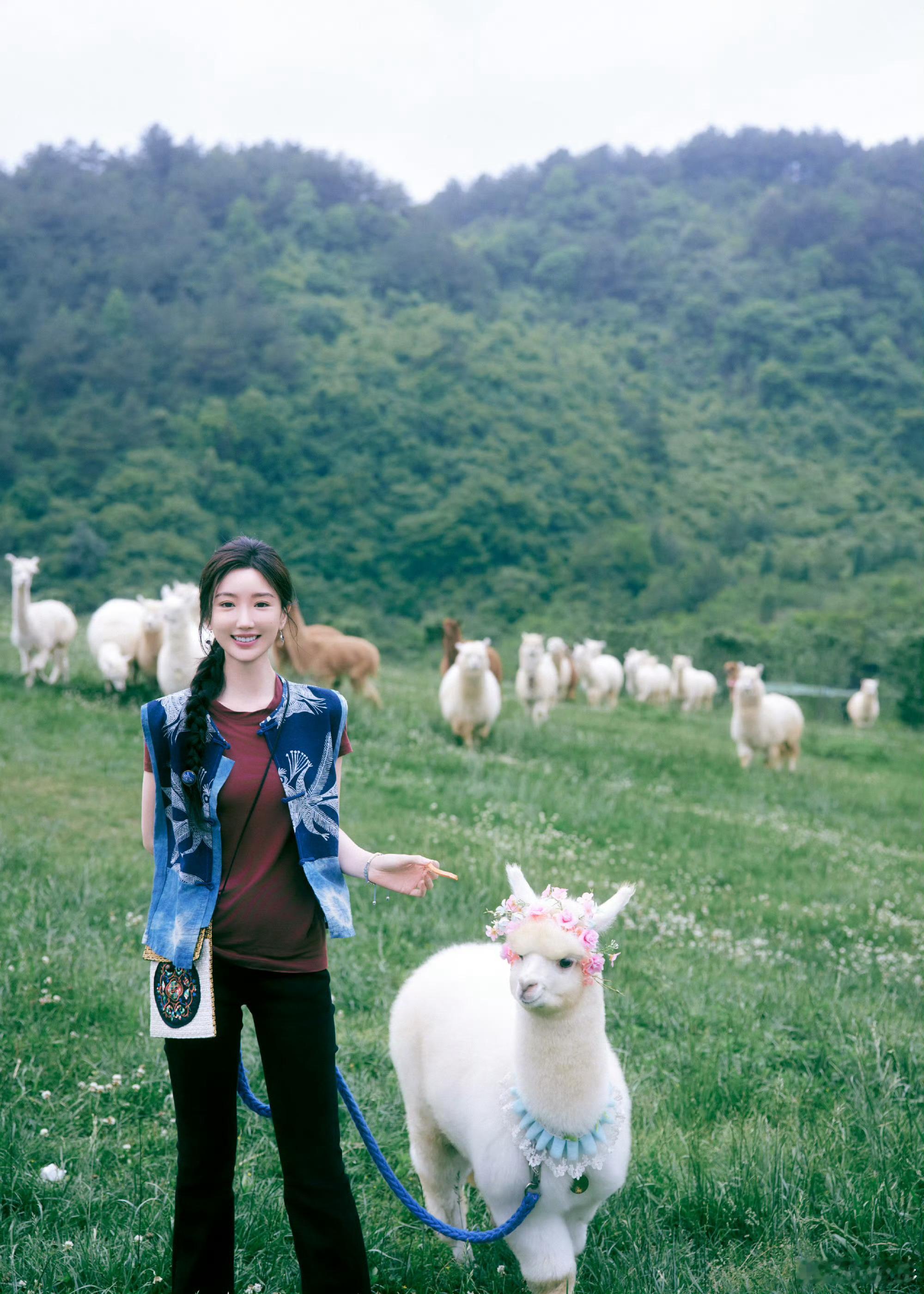 分享照片🌲蓝染背心配麻花辫,和这一片青绿好适配田园风让人看了好治愈,想魂穿被姐姐牵着的小羊
