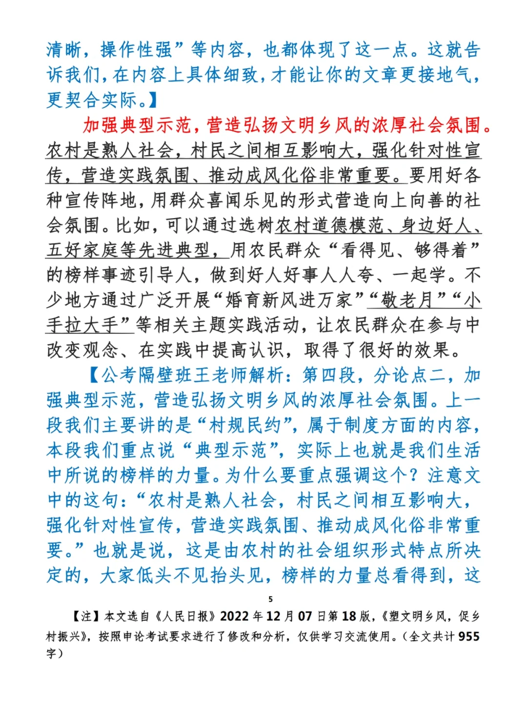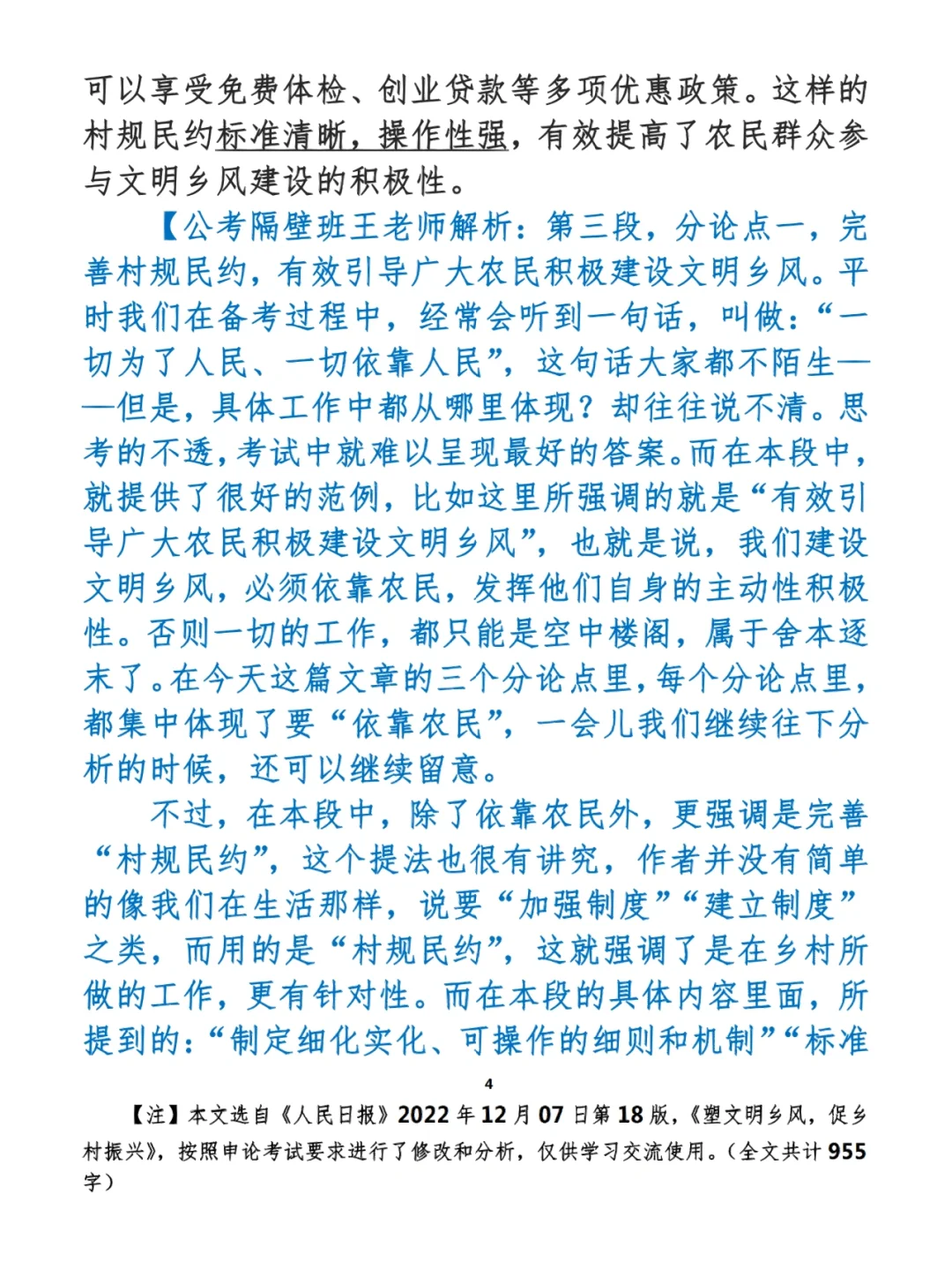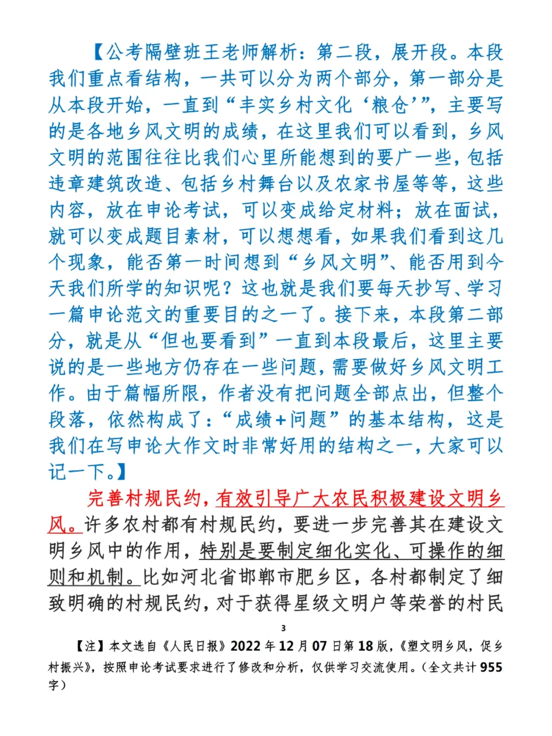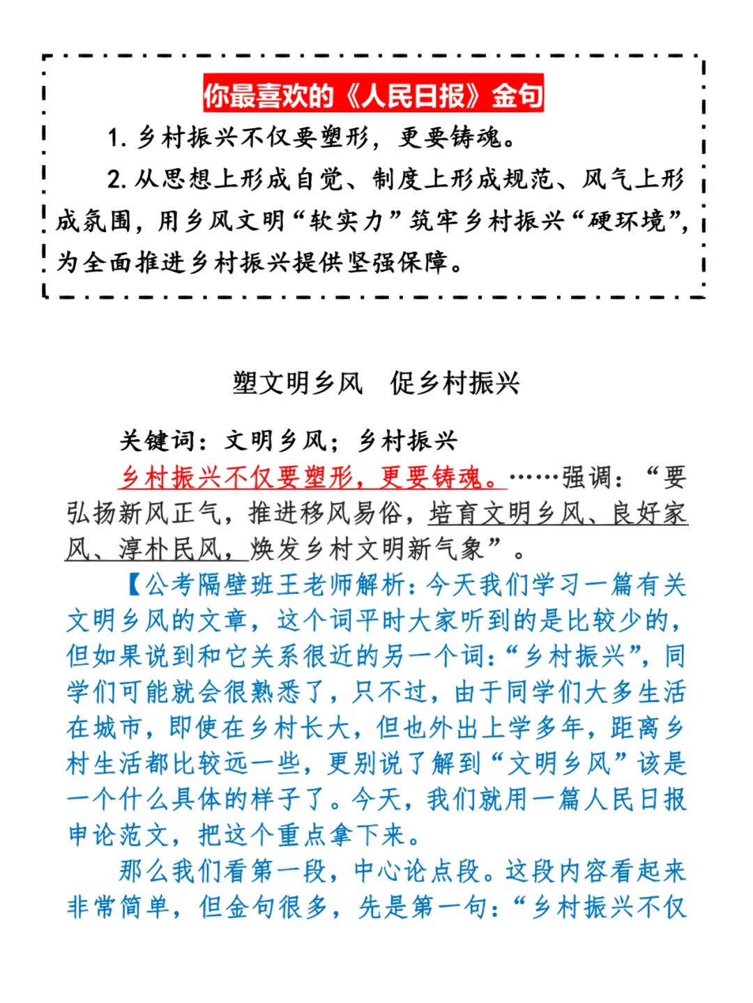 今日打卡作业: 1. 选一句你最喜欢的金句 2. 抄写全文红字+划线部分内容 3. 写完后在留言区打卡 ⭐️ ⭐️ ⭐️ ⭐️ ⭐️ ⭐️ 如何抄写:每天的抄写文章以图片形式发在“公考隔壁班王老师”账号,红色字是重点句和结构句,黑色字是正文,蓝色字是解析,大家抄写时不必抄蓝色字。建议先通读全文(包括蓝色解析部分),做到心中有数再开始抄写,效果会更好。 关于文章:抄写文章来源于人民日报,但每篇文章我都根据申论考试要求进行了修改,主要集中在四个方面:一是重写或修改开头、结尾;二是统一段首句句式结构;三是调整段落字数,使文章结构更均衡;四是简化复杂长难句,使之更具可模仿性。每篇文章修改幅度不同,无论修改多少,都是基于申论考试要求,毫无对人民日报文章品评之意。(此处致敬人民日报) 关于解析:我会在文章每段后面加一段蓝色字的解析,是我自己在抄写时的感悟,篇幅时间有限,不能面面俱到,但求重点突出。如果你有其他感悟,也希望能在评论里分享,我们相互学习、共同进步。 ⭐️ ⭐️ ⭐️ ⭐️ ⭐️ ⭐️ 这里是公考隔壁班王老师独创的“每天半小时・申论80分”抄写团,欢迎加入我们!
