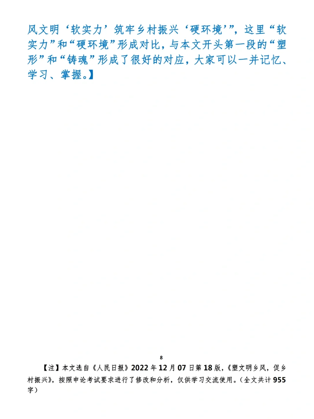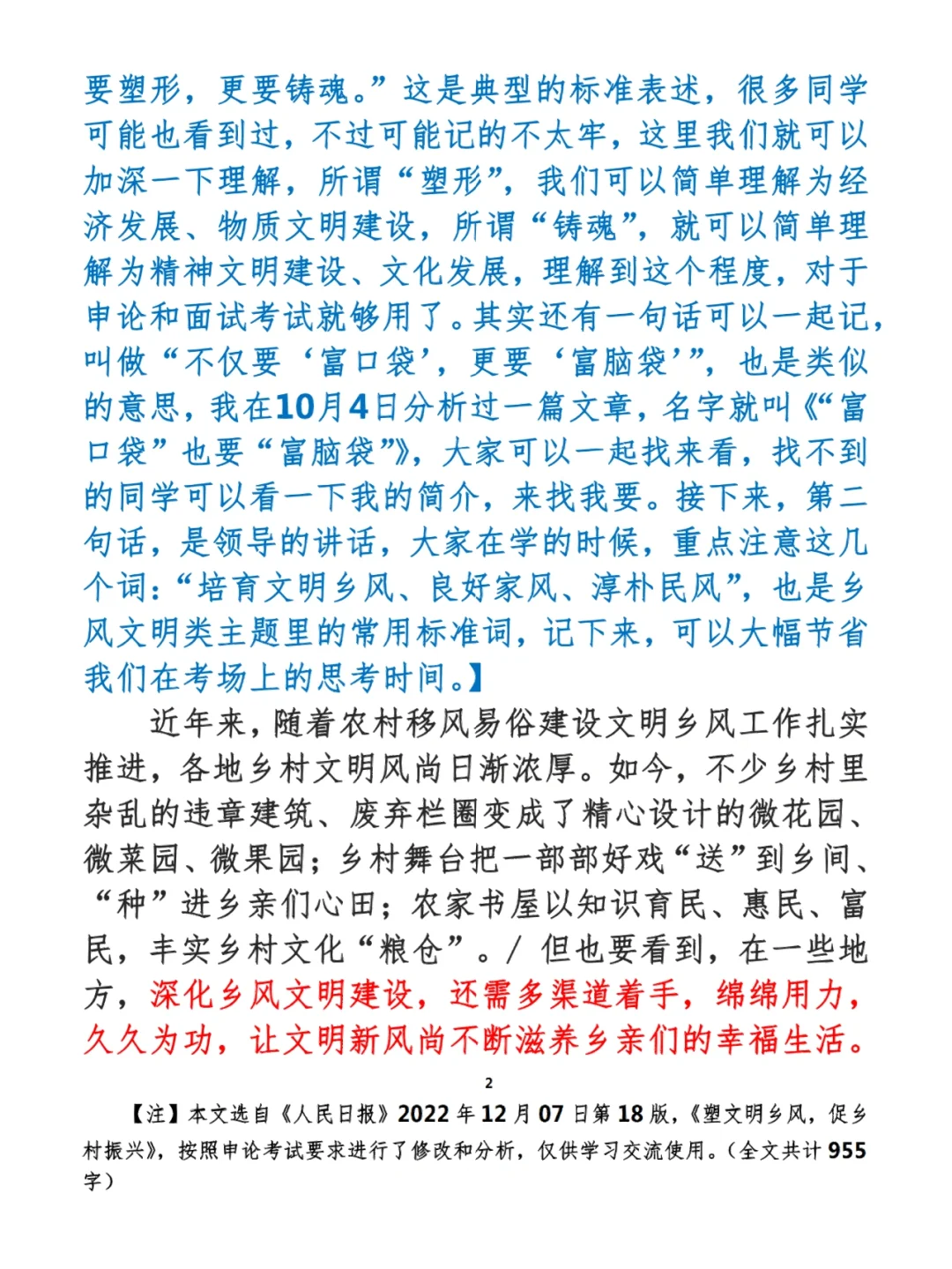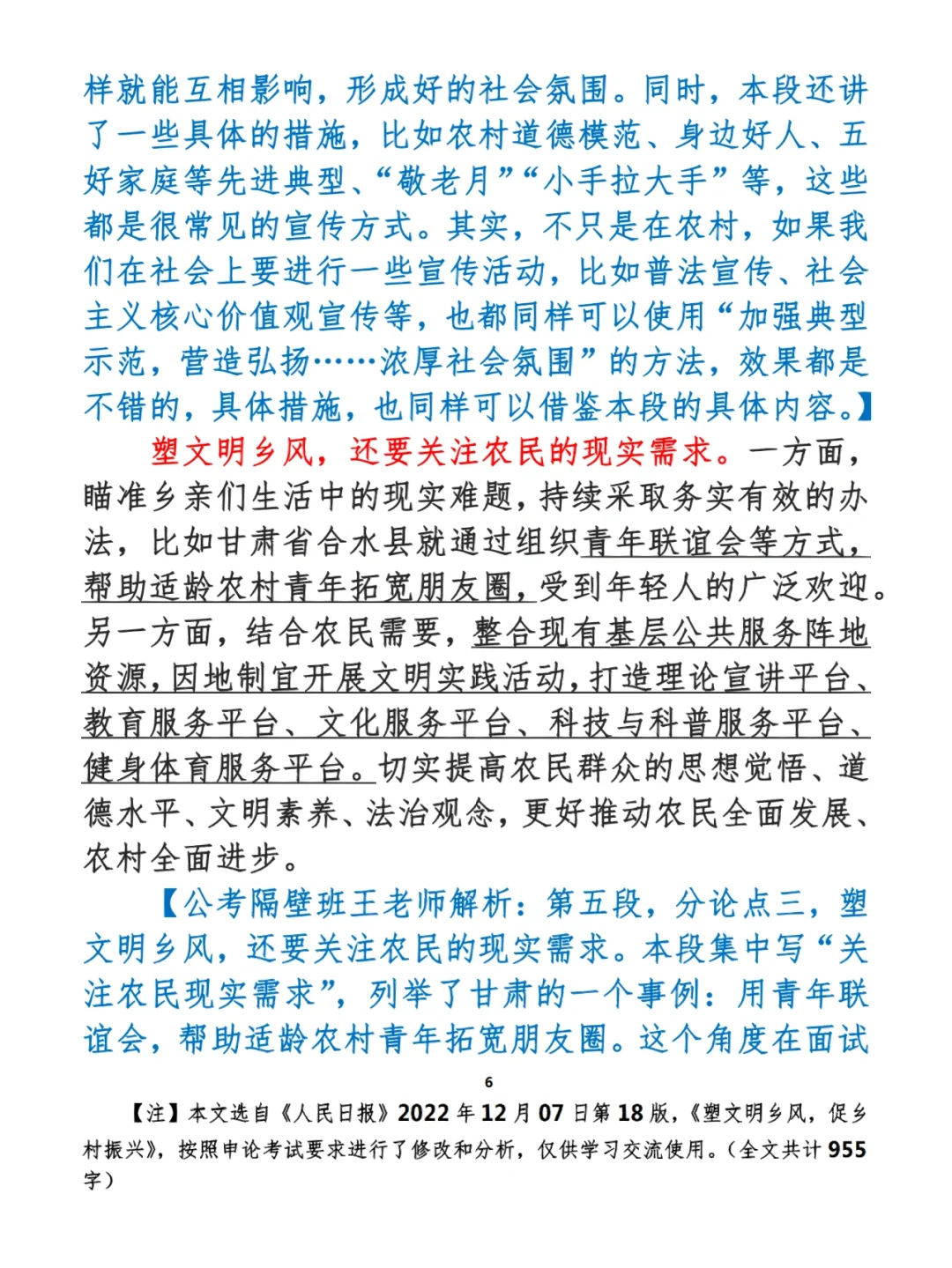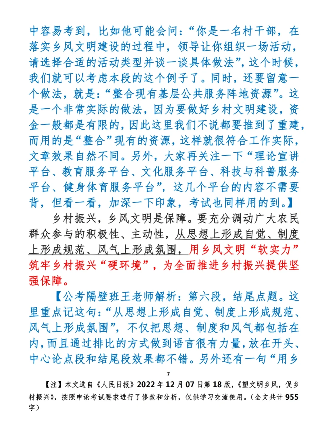今日打卡作业: 1. 选一句你最喜欢的金句 2. 抄写全文红字+划线部分内容 3. 写完后在留言区打卡 ⭐️ ⭐️ ⭐️ ⭐️ ⭐️ ⭐️ 如何抄写:每天的抄写文章以图片形式发在“公考隔壁班王老师”账号,红色字是重点句和结构句,黑色字是正文,蓝色字是解析,大家抄写时不必抄蓝色字。建议先通读全文(包括蓝色解析部分),做到心中有数再开始抄写,效果会更好。 关于文章:抄写文章来源于人民日报,但每篇文章我都根据申论考试要求进行了修改,主要集中在四个方面:一是重写或修改开头、结尾;二是统一段首句句式结构;三是调整段落字数,使文章结构更均衡;四是简化复杂长难句,使之更具可模仿性。每篇文章修改幅度不同,无论修改多少,都是基于申论考试要求,毫无对人民日报文章品评之意。(此处致敬人民日报) 关于解析:我会在文章每段后面加一段蓝色字的解析,是我自己在抄写时的感悟,篇幅时间有限,不能面面俱到,但求重点突出。如果你有其他感悟,也希望能在评论里分享,我们相互学习、共同进步。 ⭐️ ⭐️ ⭐️ ⭐️ ⭐️ ⭐️ 这里是公考隔壁班王老师独创的“每天半小时・申论80分”抄写团,欢迎加入我们!