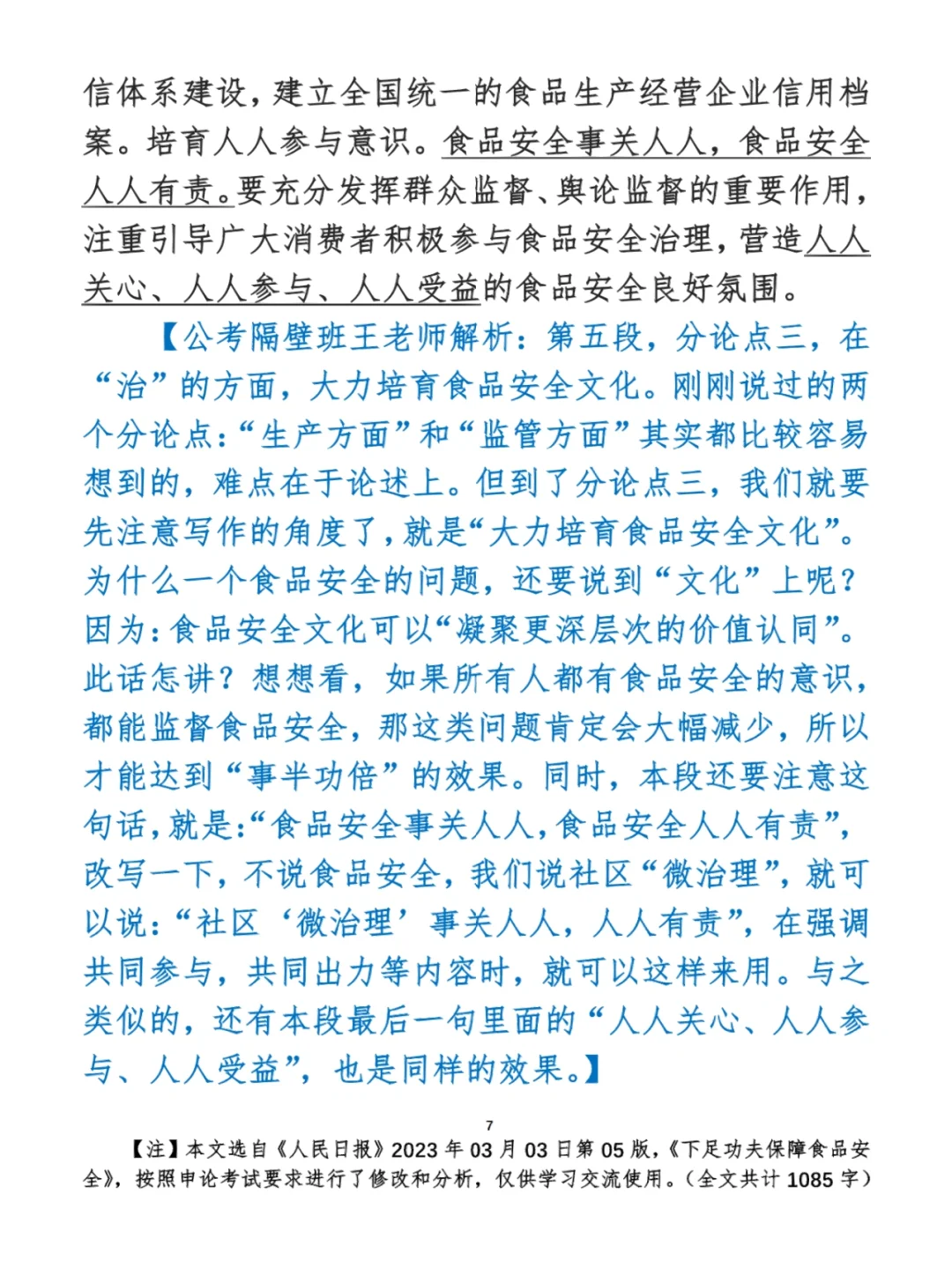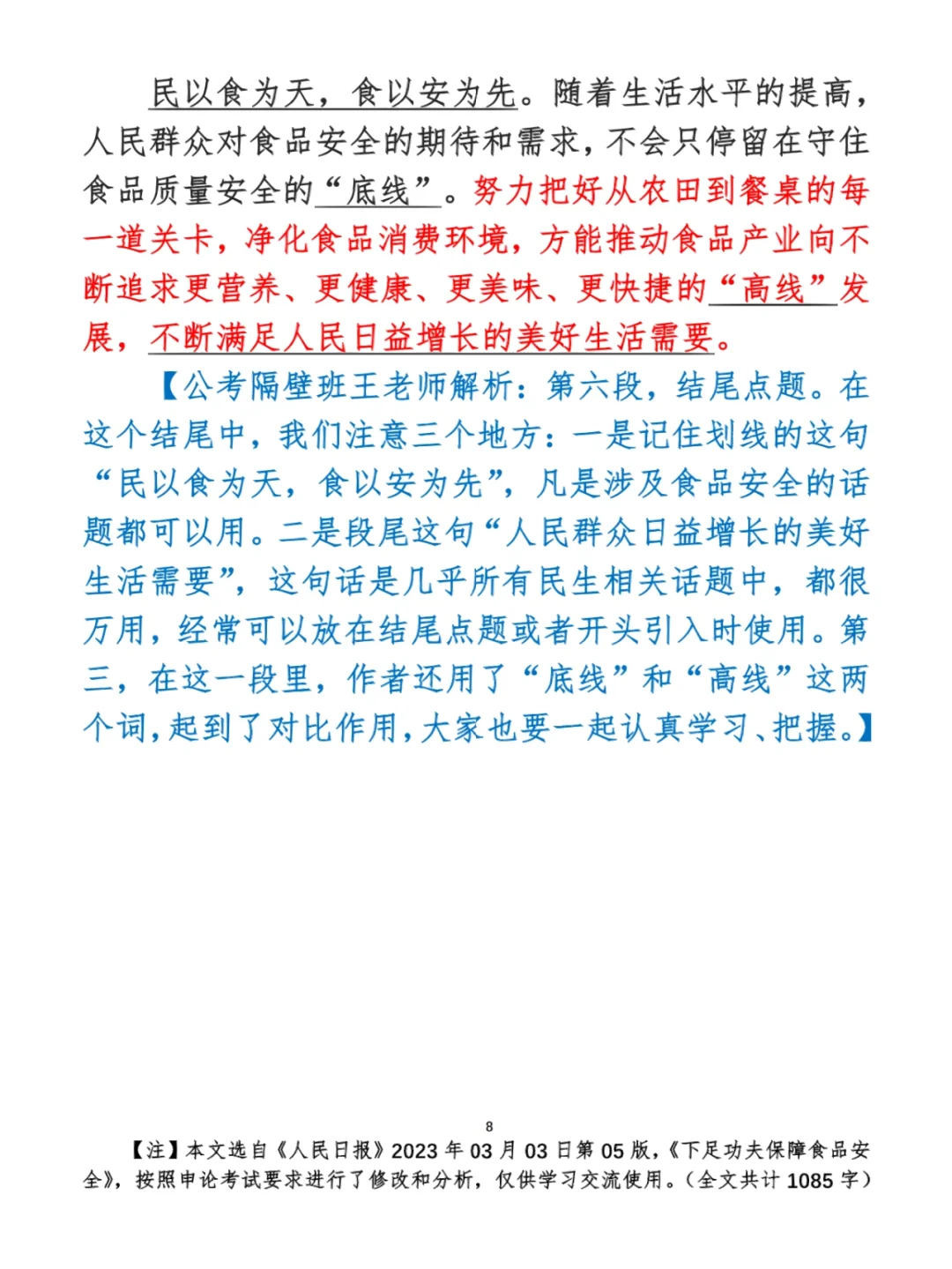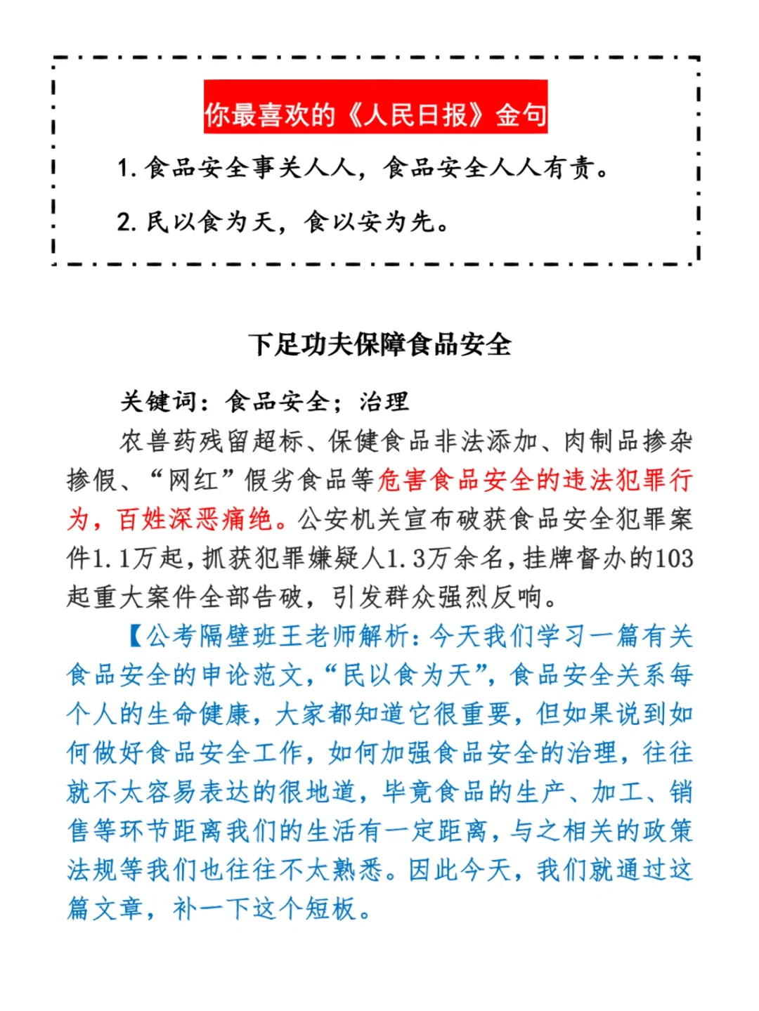 今日打卡作业: 1. 选一句你最喜欢的金句 2. 抄写全文红字+划线部分内容 3. 写完后在留言区打卡 ⭐️ ⭐️ ⭐️ ⭐️ ⭐️ ⭐️ 如何抄写:每天的抄写文章以图片形式发在“公考隔壁班王老师”账号,红色字是重点句和结构句,黑色字是正文,蓝色字是解析,大家抄写时不必抄蓝色字。建议先通读全文(包括蓝色解析部分),做到心中有数再开始抄写,效果会更好。 关于文章:抄写文章来源于人民日报,但每篇文章我都根据申论考试要求进行了修改,主要集中在四个方面:一是重写或修改开头、结尾;二是统一段首句句式结构;三是调整段落字数,使文章结构更均衡;四是简化复杂长难句,使之更具可模仿性。每篇文章修改幅度不同,无论修改多少,都是基于申论考试要求,毫无对人民日报文章品评之意。(此处致敬人民日报) 关于解析:我会在文章每段后面加一段蓝色字的解析,是我自己在抄写时的感悟,篇幅时间有限,不能面面俱到,但求重点突出。如果你有其他感悟,也希望能在评论里分享,我们相互学习、共同进步。 ⭐️ ⭐️ ⭐️ ⭐️ ⭐️ ⭐️ 这里是公考隔壁班王老师独创的“每天半小时・申论80分”抄写团,欢迎加入我们!