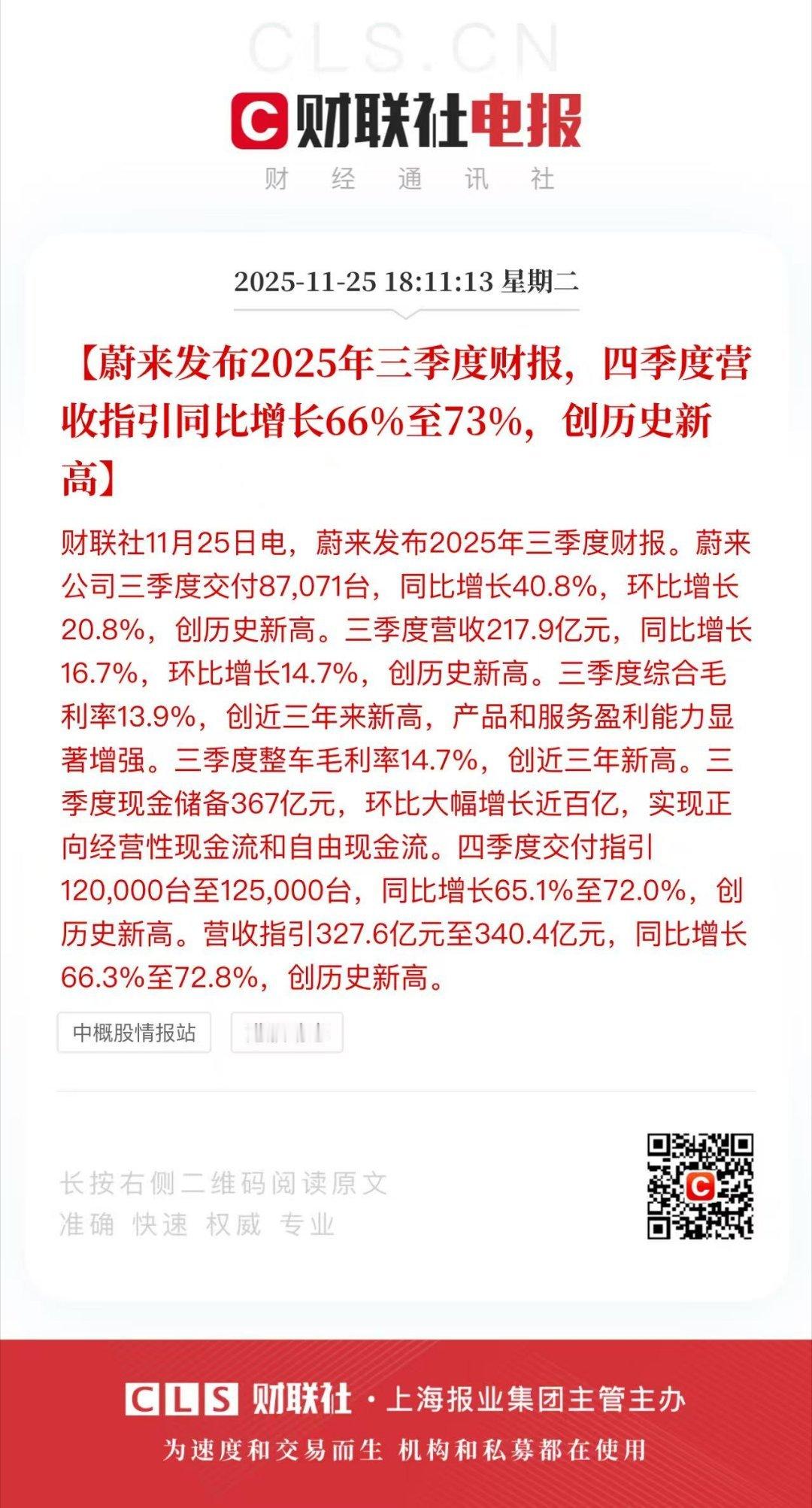 蔚来 Q3财报,各种历史新高。股市要大涨了吧~重点是 Q4的预期很好:交付指引120,000台至125,000台,同比增长65.1%至72.0%,创历史新高。营收指引327.6亿元至340.4亿元,同比增长66.3%至72.8%,创历史新高。Q3的数据也不错,营收217.9亿,毛利13.9%。净亏损收窄到 34.8 亿,调整后净亏损(非 GAAP)27 亿(貌似砍了不少研发图二)持有现金 367 亿,比 Q2 结束多了 95 亿。