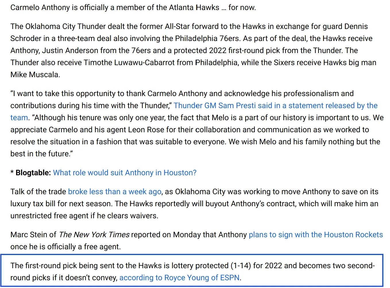 普总在2018年将安东尼送往老鹰换回施罗德的交易中送出了一枚2022年1-14保护的首轮,最终成功保护变为了榜眼秀切特霍姆格伦,老鹰则是得到两个次轮。网友评论:送出的“虚假的”首轮是最好的首轮!编辑by蓝色狂潮OKC