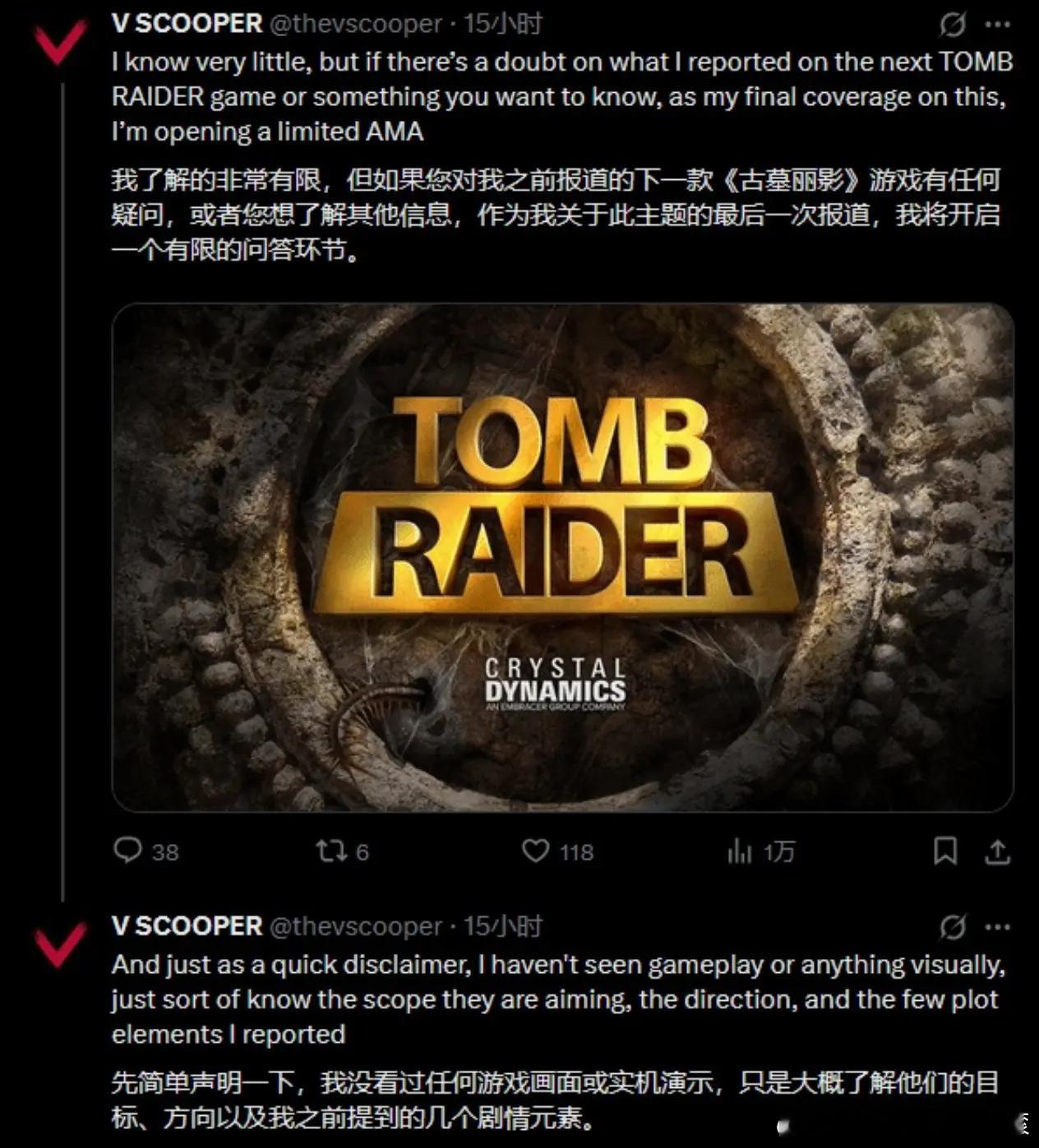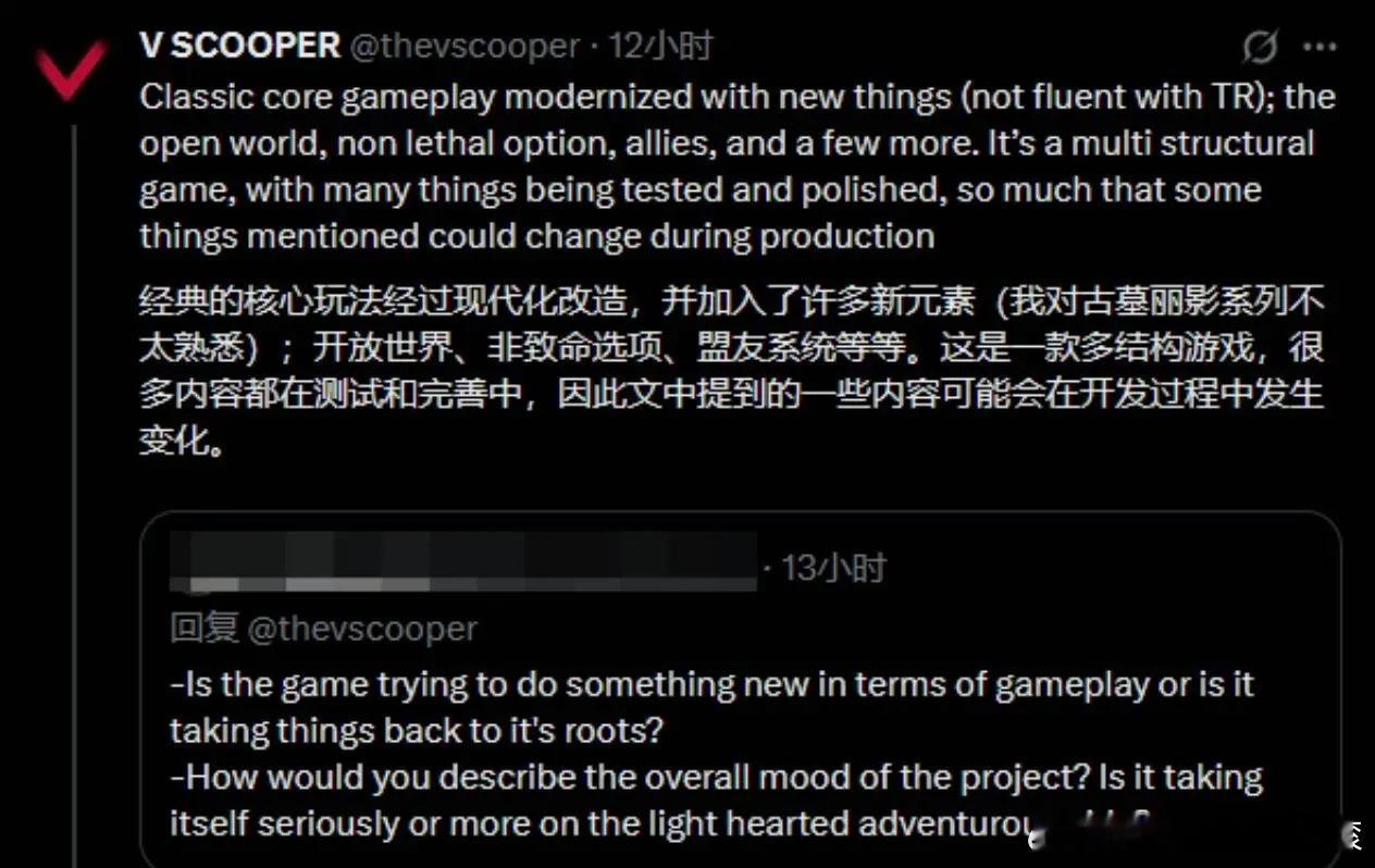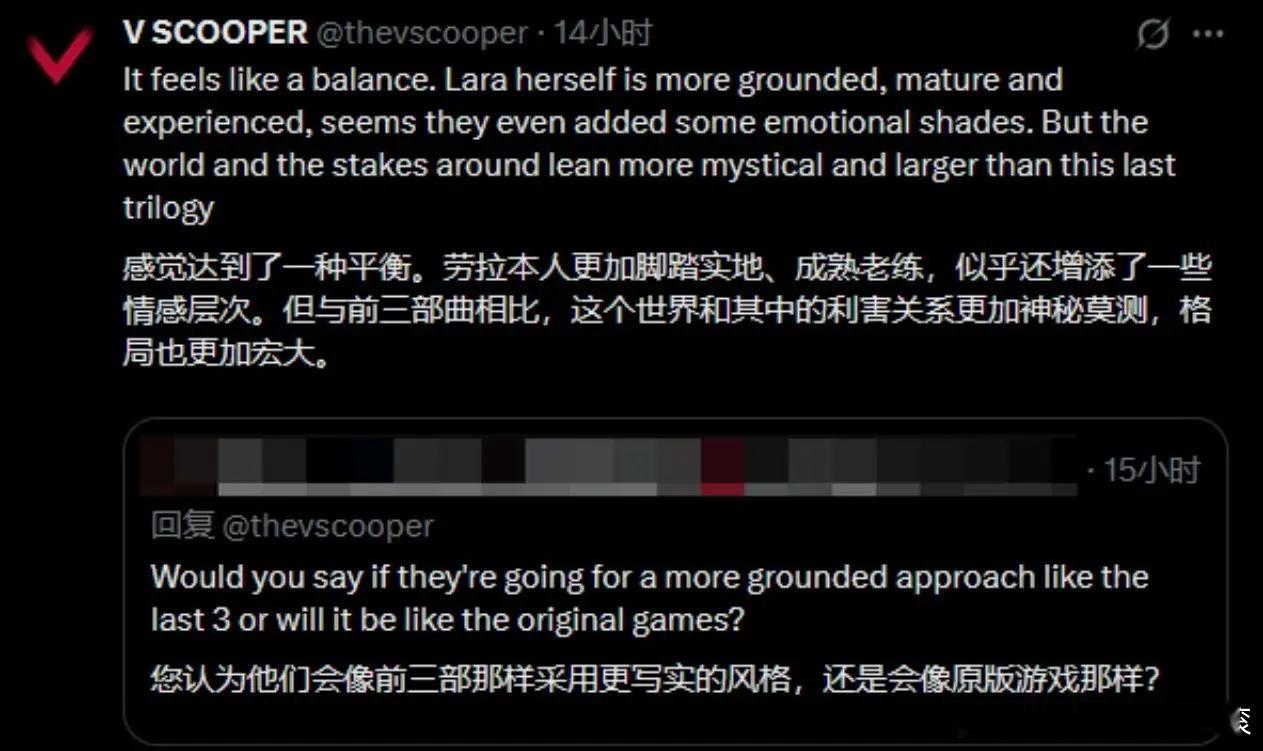 知名消息人士V SCOOPER近日通过社交媒体透露了《古墓丽影》新作的重要进展。从他的回复网友的内容中可以看到全新的古墓丽影似乎跟以往的大不相同,游戏的玩法将实现全面升级了!