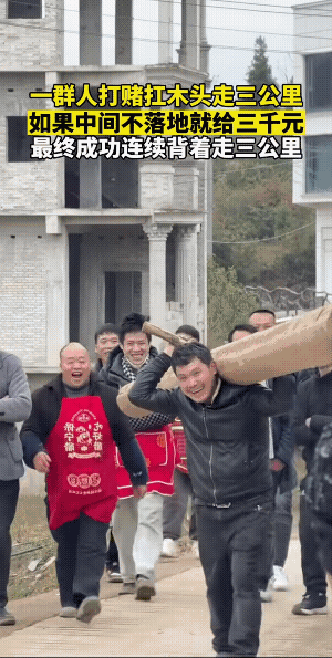 现代版的“徙木立信”,秦朝商鞅变法就有这么个事。不过那是城南到城北,三尺长木头也不重,路程更没有三公里。 三公里的距离,农村说的六里地,还是很长的,徒步走也得至少半个小时以上。 小伙子扛上这样子重的木头走(差不多有百斤重),一气不落地,的确不是100%的把握。 还好!小伙子高高兴兴的完成了。