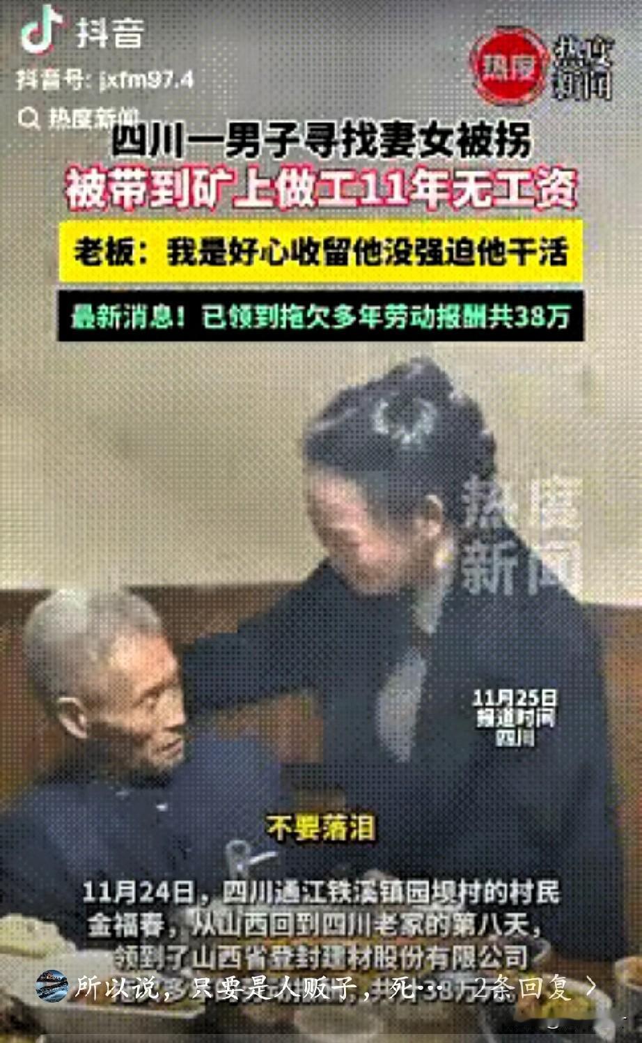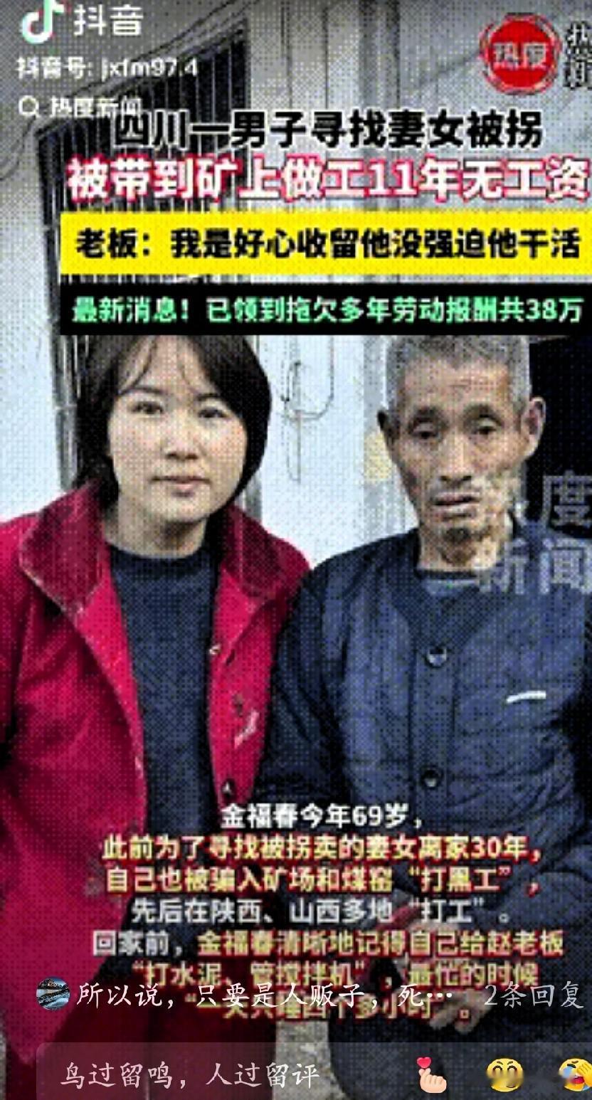 四川通江,一40岁男子干完活回家,发现聋哑妻子和4岁女儿不见了。 揣着借来的150块路费,满心期盼地跟着亲戚李大玉出门寻亲,可他怎么也想不到,这一去,就是30年的人间炼狱。 刚到河南灵宝,他就被直接推进金矿洞,监工的铁链瞬间锁住了他的自由,每天在漆黑的矿洞里挖矿十几个小时,吃的是硬得能硌碎牙的窝头,喝的是浑浊的凉水,稍慢一步,鞭子就会狠狠抽在身上。 一年后,他又被转卖到山西黑煤窑,这里没有窗户,只有漫天飞舞的煤灰和永无止境的殴打,有工友试图逃跑,被抓回来后活活打残,而金福春的肋骨,也被打断了三次,手指被砸得变形,记忆在日复一日的折磨中逐渐模糊,唯一支撑他活下去的,就是“妻女还在等我”的执念。 与此同时,他的妻女正经历着颠沛流离,被多次转卖后,女儿金俊16岁就被迫嫁人,2018年通过志愿者找到老家时,父亲早已成了村里“消失的人”。而金福春的弟弟,守着老屋整整30年,每年春节都固执地多摆一副碗筷,坚信哥哥总有一天会回家。 2025年,山西警方在稷山县一个搅拌站发现了他,彼时的他穿着露棉花的破袄,在寒风中筛沙子,连续11年没领过一分工资,老板所谓的“好心收留”,不过是赤裸裸的剥削。被解救后,他终于拿到了38万补偿,可这38万,怎么抵得过31年的骨肉分离和满身伤痕? 重逢时,金福春认不出眼前的女儿,却在摸到老屋门框上的童年划痕时,浑浊的眼睛里闪过一丝光亮。 万幸的是,女儿从未放弃寻找,政府也主动上门落实帮扶政策。坏人的恶再狠,也敌不过家人的牵挂和社会的公道。