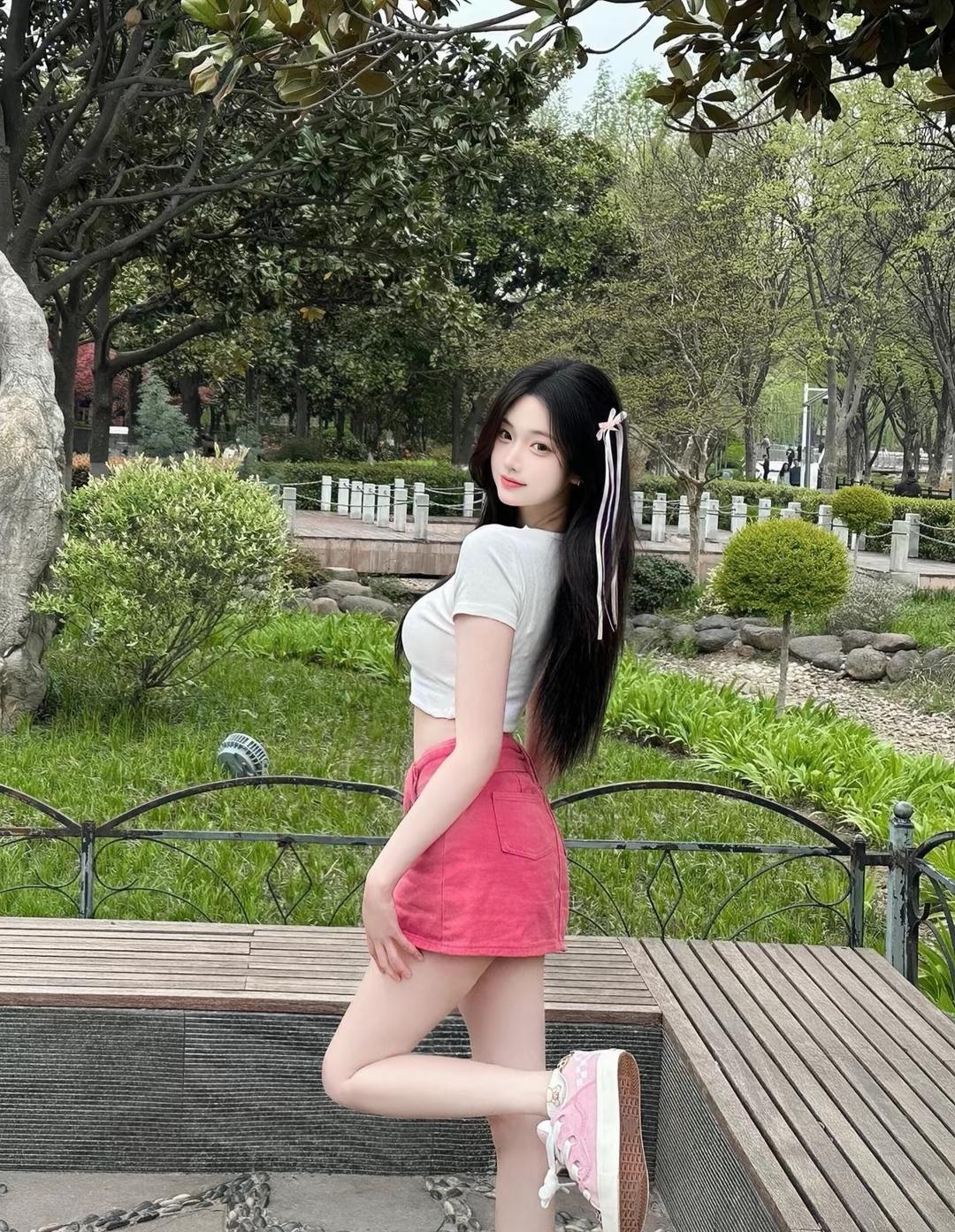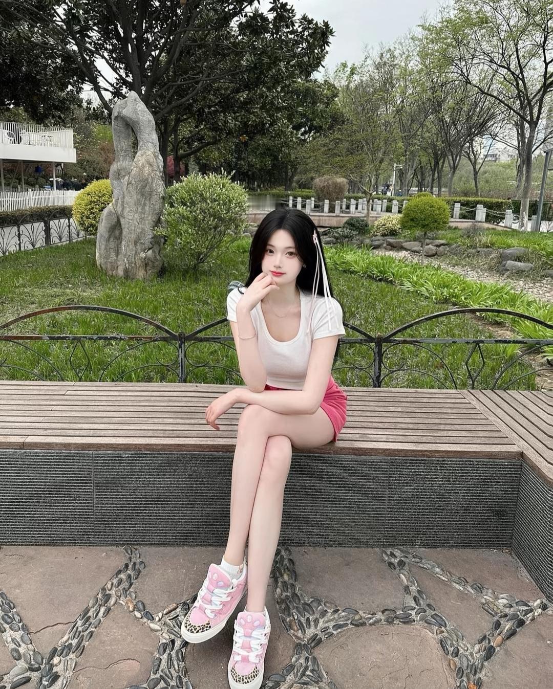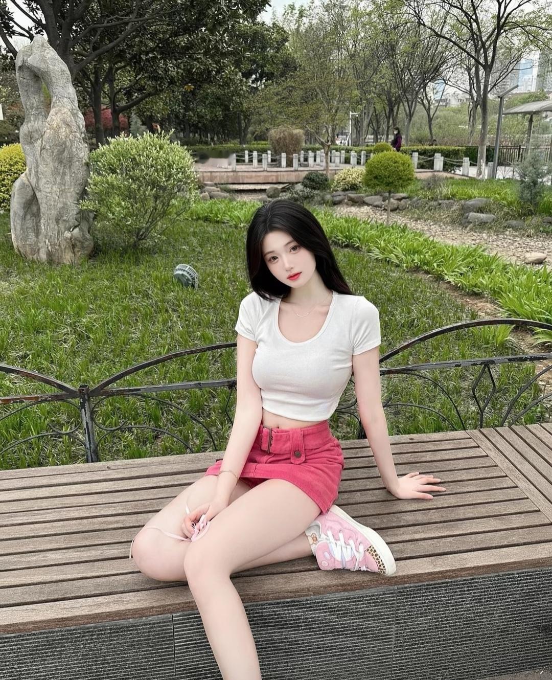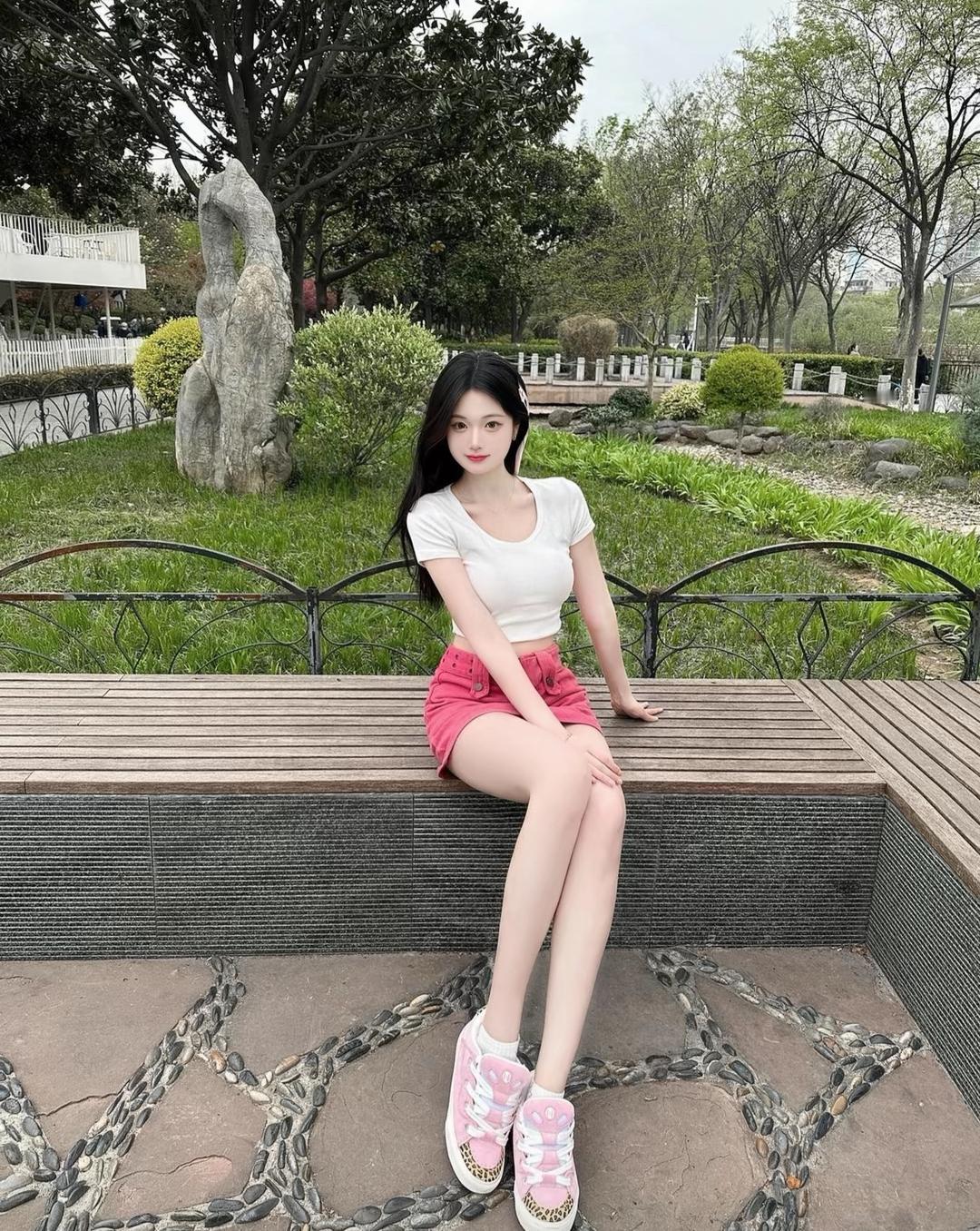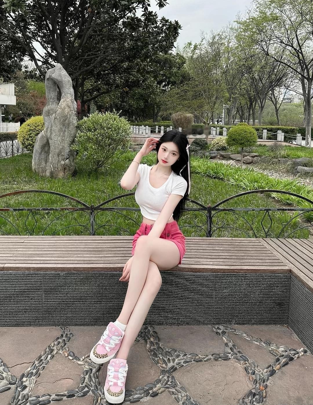 公园长椅上的甜美少女,粉色裙子和运动鞋,清新自然!🌿👗👟