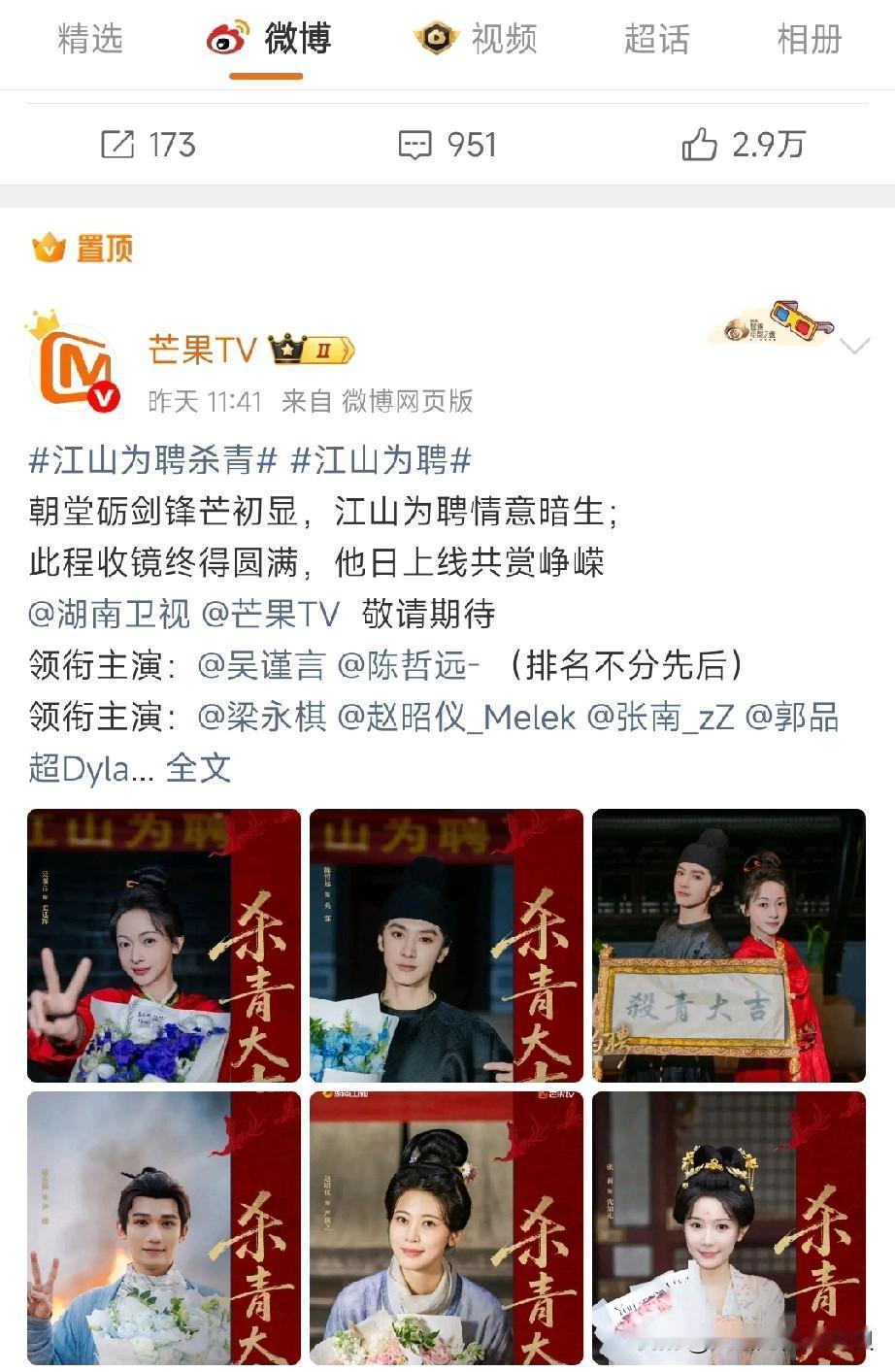 感觉芒果台还是挺看好吴谨言和陈哲远这部古装剧的。 官博置顶了两条杀青微博,给的待遇和排面还是足足的。 可惜陈哲远粉丝依然是在评论区各种叫嚣,弄得小编只能开启了评论精选。[捂脸] 我现在特别期待这剧的播出。 一是想看剧外撕吧的这么厉害的两个团队,剧里两位主演是如何演绎深情款款的。[捂脸] 二是想看这剧的播放数据。 要是播的好了,估计以后会有更多剧效仿这种黑红的营销模式吧。 于正估计会更火了,谁都想跟他家艺人合作了。[呲牙] 吴谨言 冬日生活打卡季 创作训练营开营啦